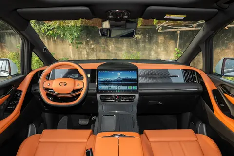 内饰采用“马会庄园”红棕配色,营造典雅氛围。12.3英寸全液晶仪表与 15.6 英寸中控多媒体触控屏形成双联交互,搭配双辐式方向盘与电子怀挡,科技感十足。中控通道区域采用 “一横两纵” 创新布局,翻盖式储物格、无线充电面板与双杯架的组合,大幅提升实用便利性。空间上,2+2+3 的 7 座布局满足多场景需求,二排独立航空座椅配备专属触控面板,支持加热、通风与按摩功能。此外,双层隔音玻璃搭配主动降噪技术营造静谧座舱,BOSE 音响与全景天窗提升驾乘体验。