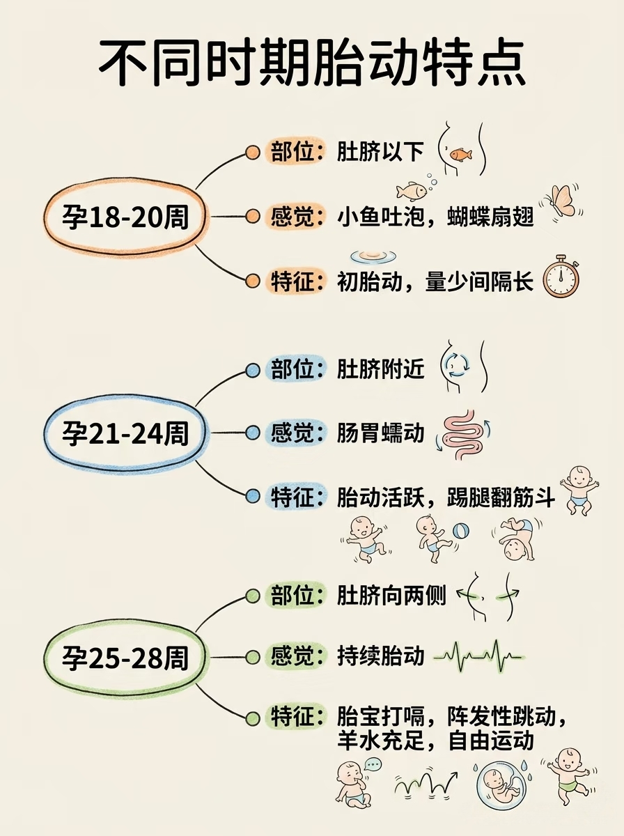 感觉: 像小鱼吐泡泡,又像蝴蝶扇动翅膀。这是最神奇的阶段,很多人会以为是肠胃蠕动而错过。这时候胎动还很少、很轻,别着急,宝宝只是在试探“场地”呢。