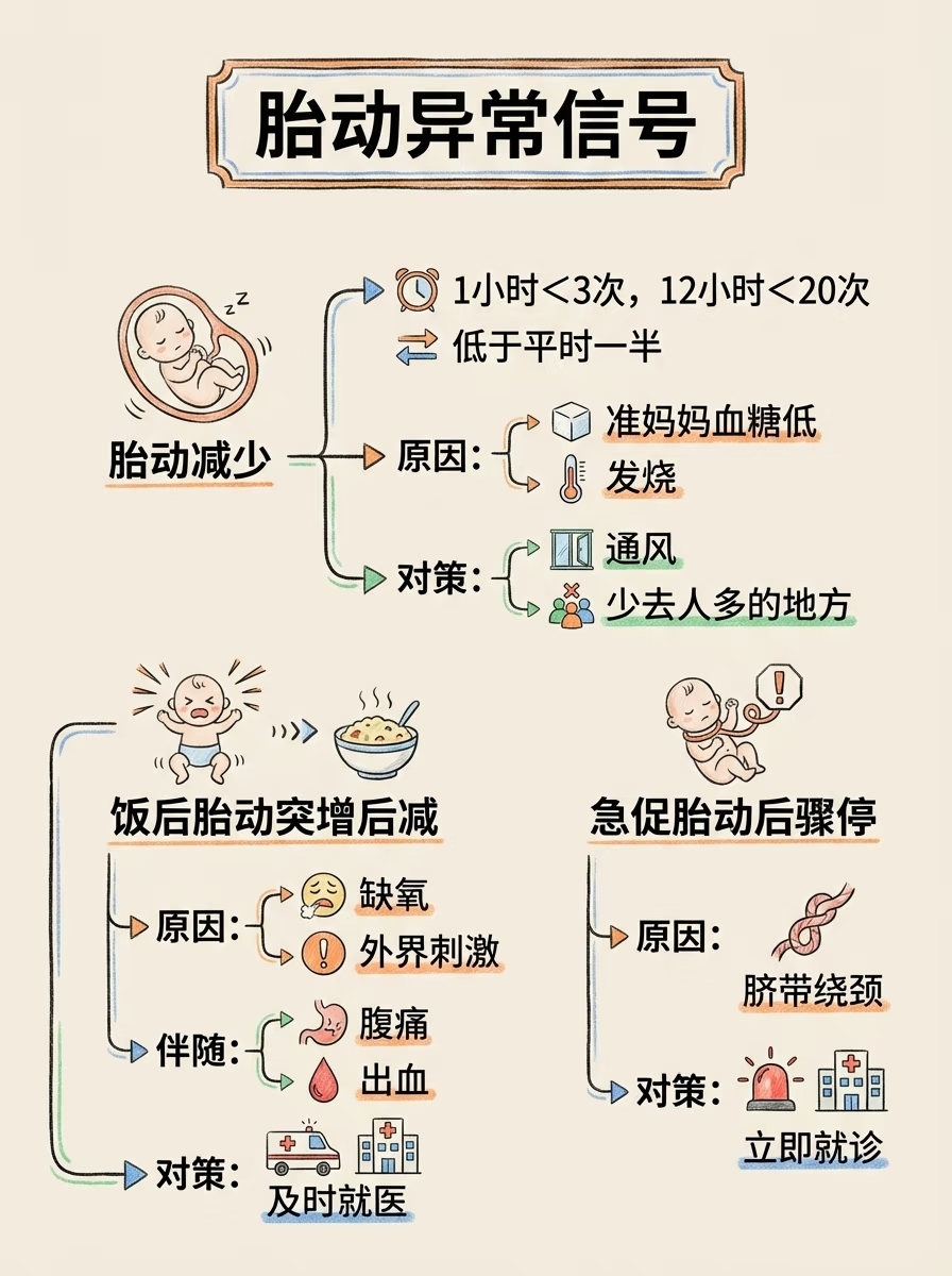 · 警惕:这可能是脐带绕颈过紧或扭转!宝宝在挣扎后耗尽了力气,处于缺氧窒息风险中! 这是最危险的信号,必须马上去医院做胎心监护或B超!