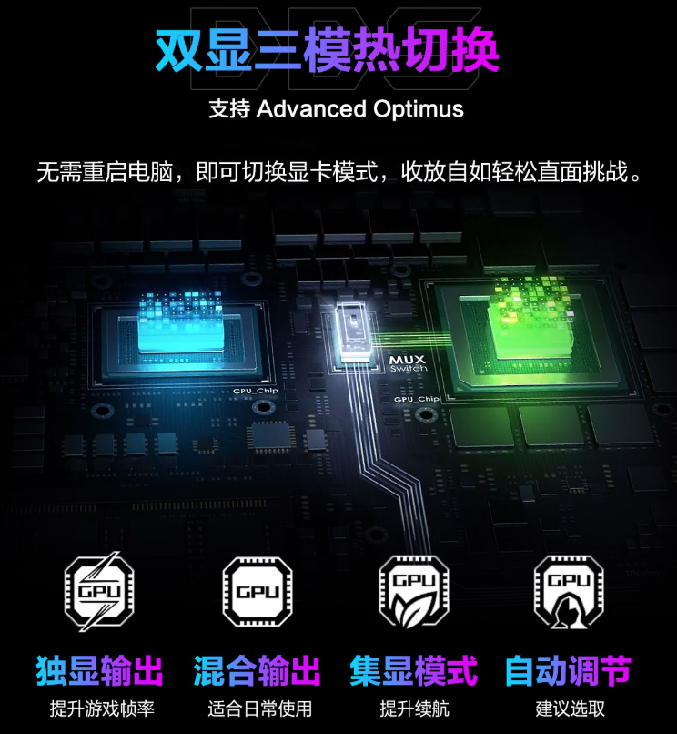 此外,还有双显三模热切换功能,更懂玩家心思!无需重启,即可在独显输出、混合输出与集显模式间快速秒切,电竞激战与移动办公无缝衔接。