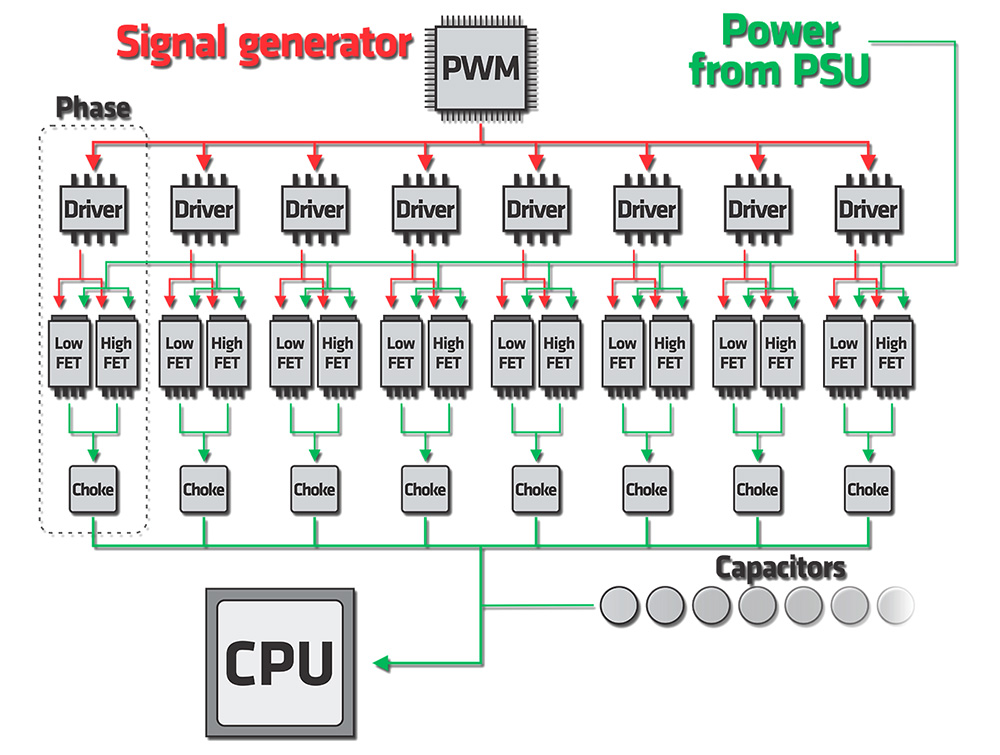 理论上,相数越多,单相分摊的电流压力越小,供电温度越低,CPU运行越稳。