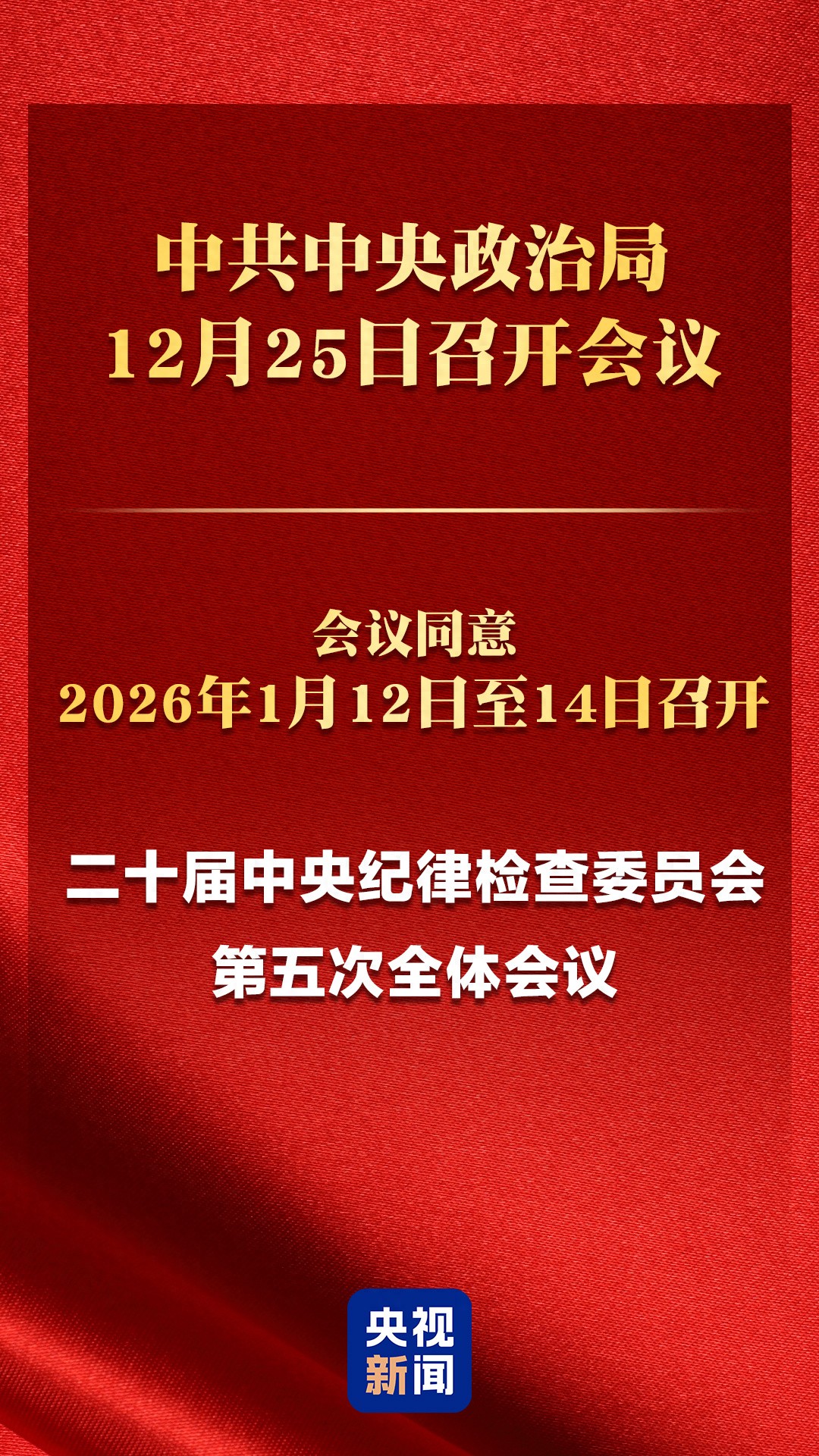 中共中央政治局12月25日召开会议,会议同意明年1月12日至14日召开二十届中央纪律检查委员会第五次全体会议。