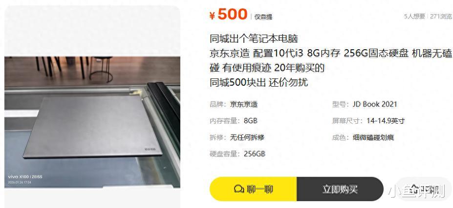 这台机器的原价当年应该在2500到3000之间,现在500块拿下,折价率高达80%,保值率确实低得吓人。但换个角度想,对咱们买家来说,这就是实打实的捡漏。对比二手鱼上同配置的其他品牌,比如联想、华硕的轻薄本,同配置基本都要七八百甚至上千,这台京东京造500块的价格,性价比一下子就出来了。