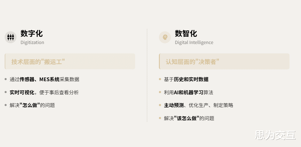 “数字化”通常指将线下的物理流程和数据搬到线上,解决“怎么做”的问题;而“数智化”则是在此基础上加入了算法的力量,解决“该怎么做”的问题。