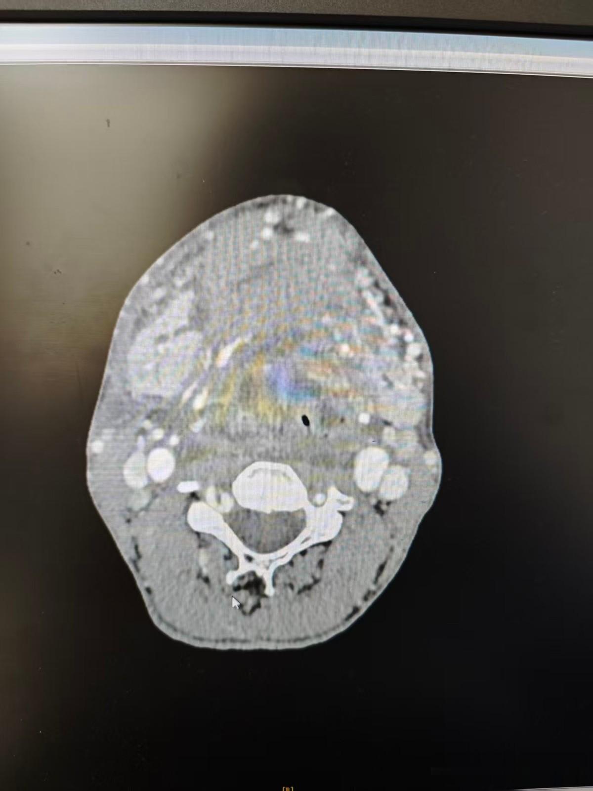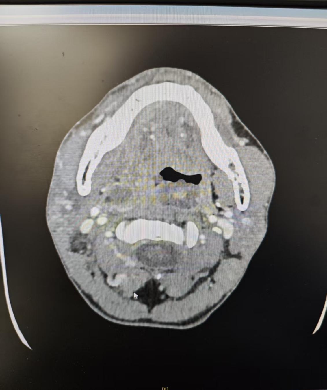 等待CT结果的1个小时,仿佛一个世纪那么漫长。急诊科、我们科室的医生全程守在患者身边,密切监测他的呼吸、心率,随时准备应对突发情况。终于,CT片传到了电脑上,画面让所有人都倒吸一口凉气:患者右侧口底间隙、颌下间隙、咽旁间隙广泛炎症水肿,多处散在脓肿形成,而咽喉最狭窄的会厌平面,已经被肿胀的黏膜堵塞得所剩无几,气道濒临闭塞——这意味着,患者的呼吸随时可能中断,抢救刻不容缓!