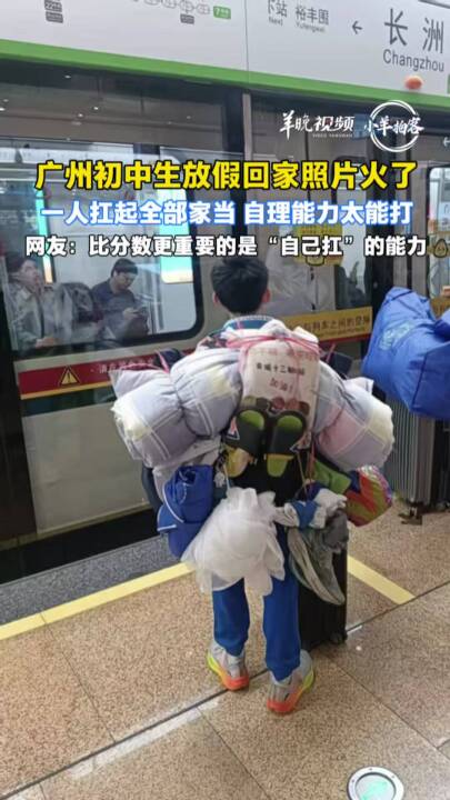 1月30日,广州中小学迎来寒假。在地铁7号线长洲站,有市民拍到一名学生独自背着鼓鼓囊囊的行李候车,被褥、蚊帐、运动鞋、拖鞋层层叠叠,甚至还有一只被行李完全包围住的“大湾鸡”。这名学生哥的背影几乎被身上堆成小山的行李吞没,背包带也深陷进他的肩膀。