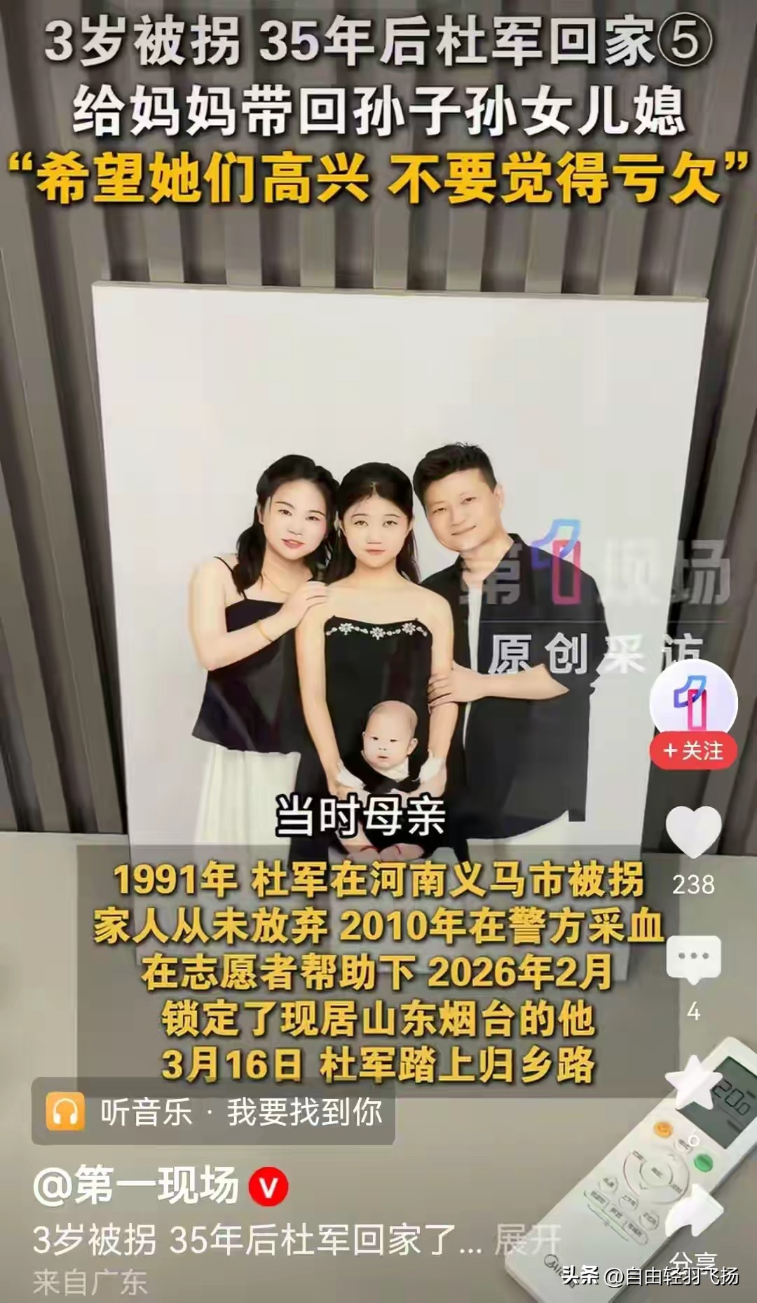 日子刚有起色,又添了个儿子,7个月大,胖嘟嘟的,一笑就露出俩小牙。儿女绕膝,生意安稳,可杜军心里总像空了一块——他不知道自己叫啥,家在哪,爹娘长啥样。