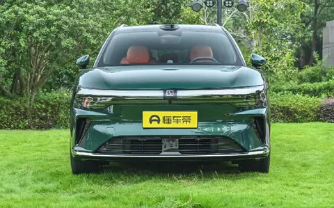 此外,整个车辆在外观设计上表现得非常时尚,具有明显的新能源汽车特色。车身前脸采用封闭式格栅设计,并配备贯穿式LED行车灯带,灯带与大灯一体化设计,整体非常有科技感。行车灯带还拥有一体式智慧灯幕,灯幕尺寸达到93英寸,内含1831颗高功率LED灯珠,可实现13种灯效,有效提升了整车的时尚感。车辆格栅下方配备梯形进气口,进气口上有横向镀铬饰条,可根据需求主动闭合。格栅两侧的三角形导流槽进一步提升了整车的层次感,并优化了空气动力学性能。