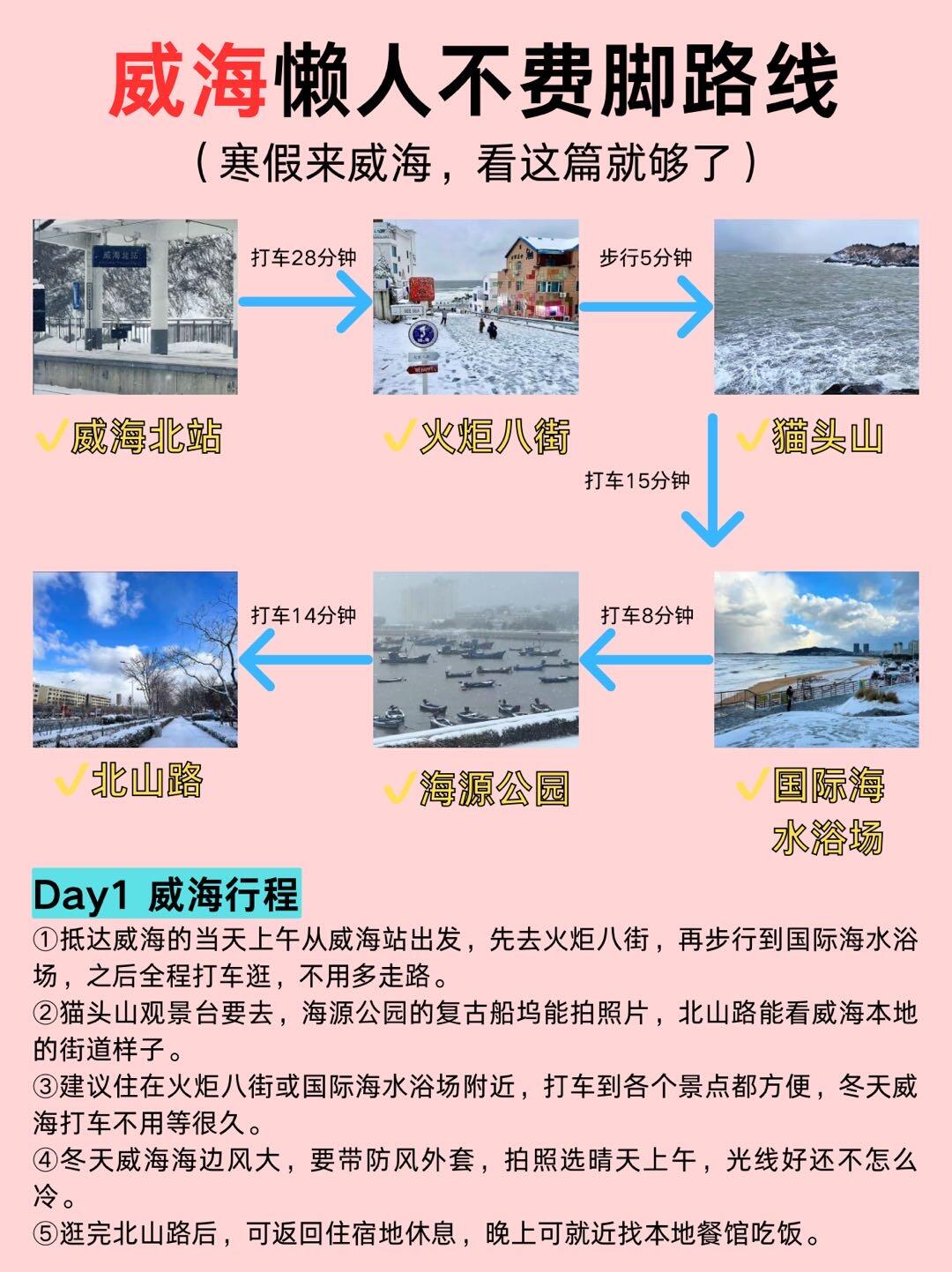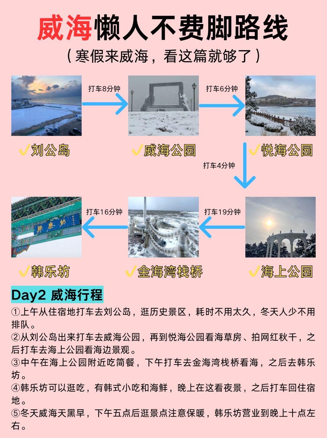 打车去刘公岛逛历史景区,再到威海公园、悦海公园、海上公园看景,下午去金海湾栈桥,晚上到韩乐坊吃韩式小吃、看夜景,五点后逛景点注意保暖。