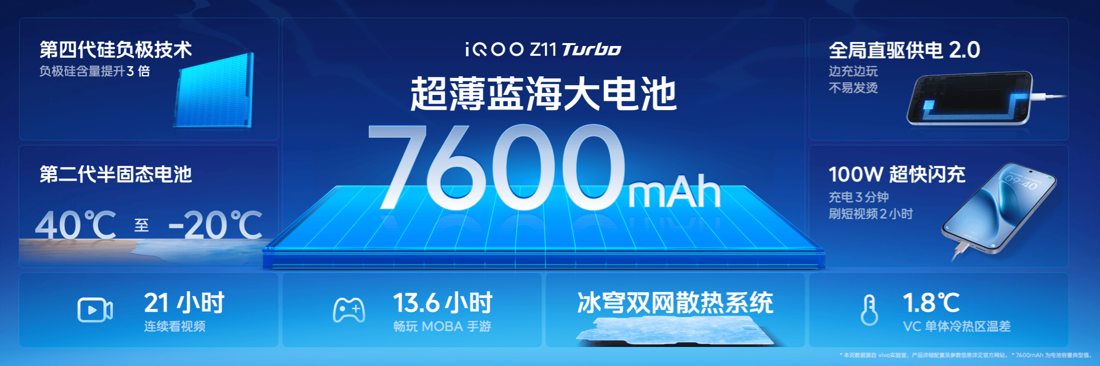iQOO Z11 Turbo内置7600mAh超薄蓝海大电池,采用行业领先的第四代硅负极技术,能量密度达iQOO全系最高的860Wh/L,续航能力远超同尺寸性能机。配合100W超快闪充与全局直驱供电2.0技术,边玩边充不发烫、不伤电池,一杯咖啡的时间即可回血过半。
