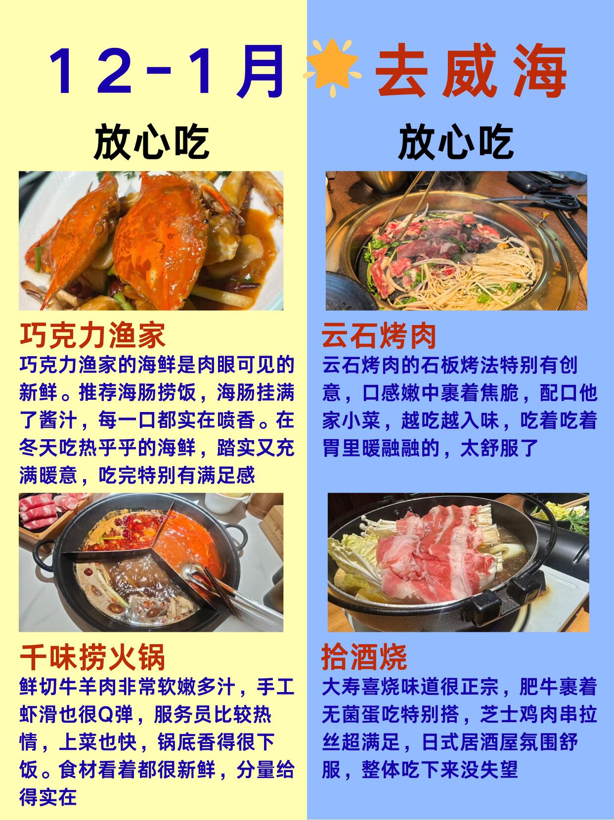 ⚠️猫头山记得去2、3号观景台,角度很出片的,入眼大片雪白❄️的山和蔚蓝的海,信我你就去👌🙂3️⃣除了雪景还有吃的🥘也要说说:头天中午去吃了巧克力渔家🦞,他家很火爆,还没来威海前就被疯狂安利了……点了招牌海肠捞饭和海鲜套餐,没有失望,口感挺棒的。贝类🦪的肉质很新鲜爽口,海肠特别适合拌饭吃。