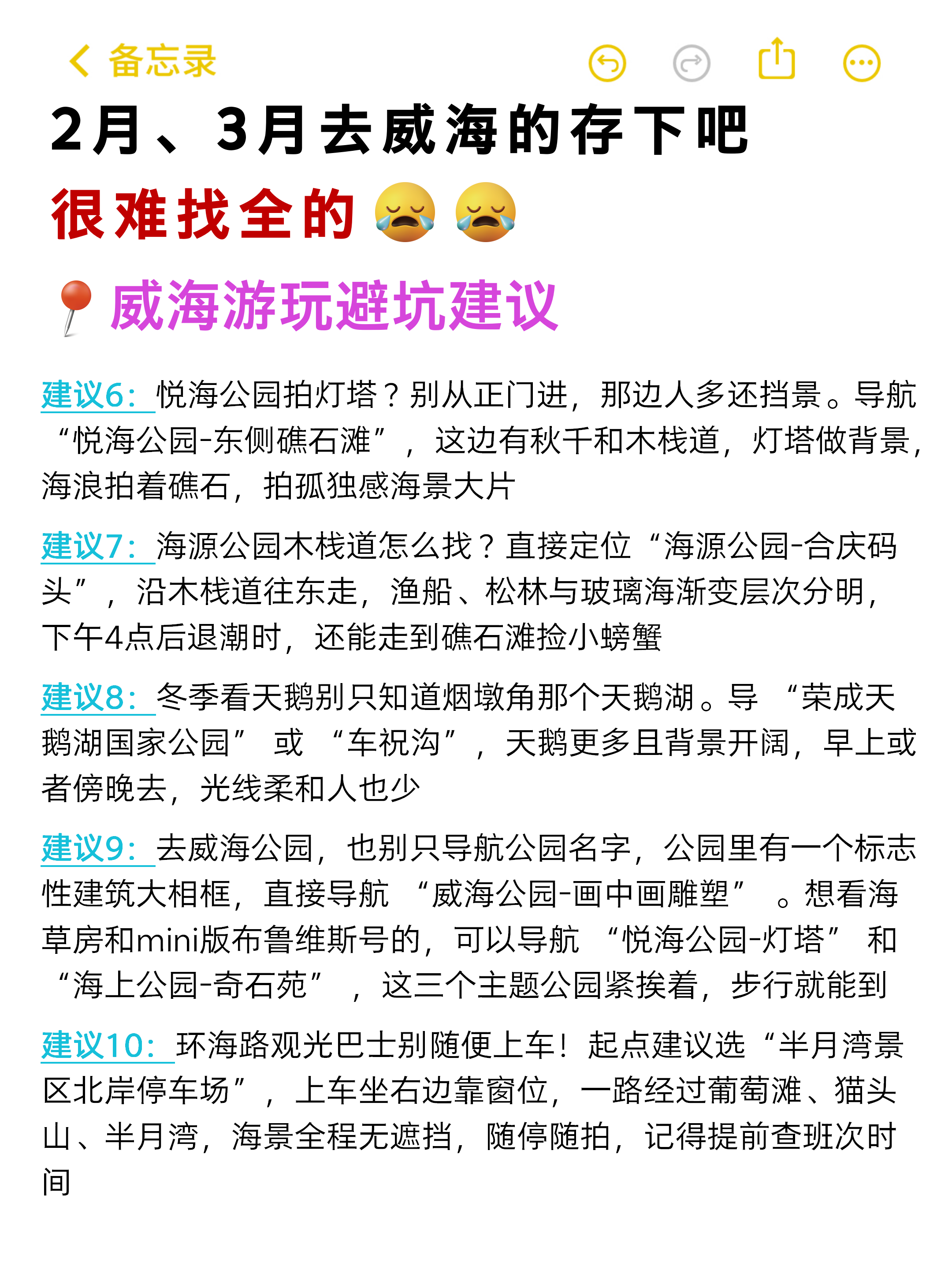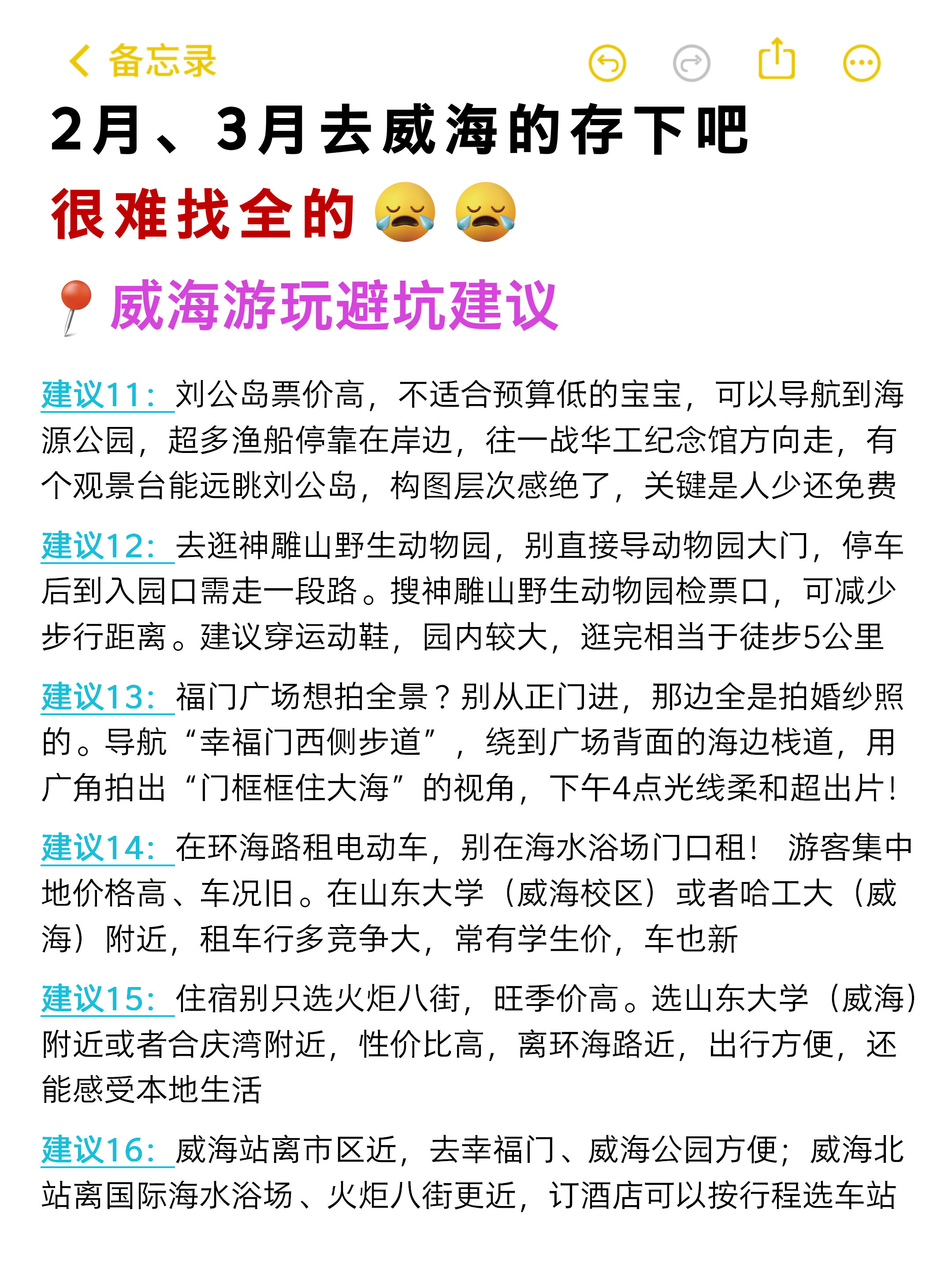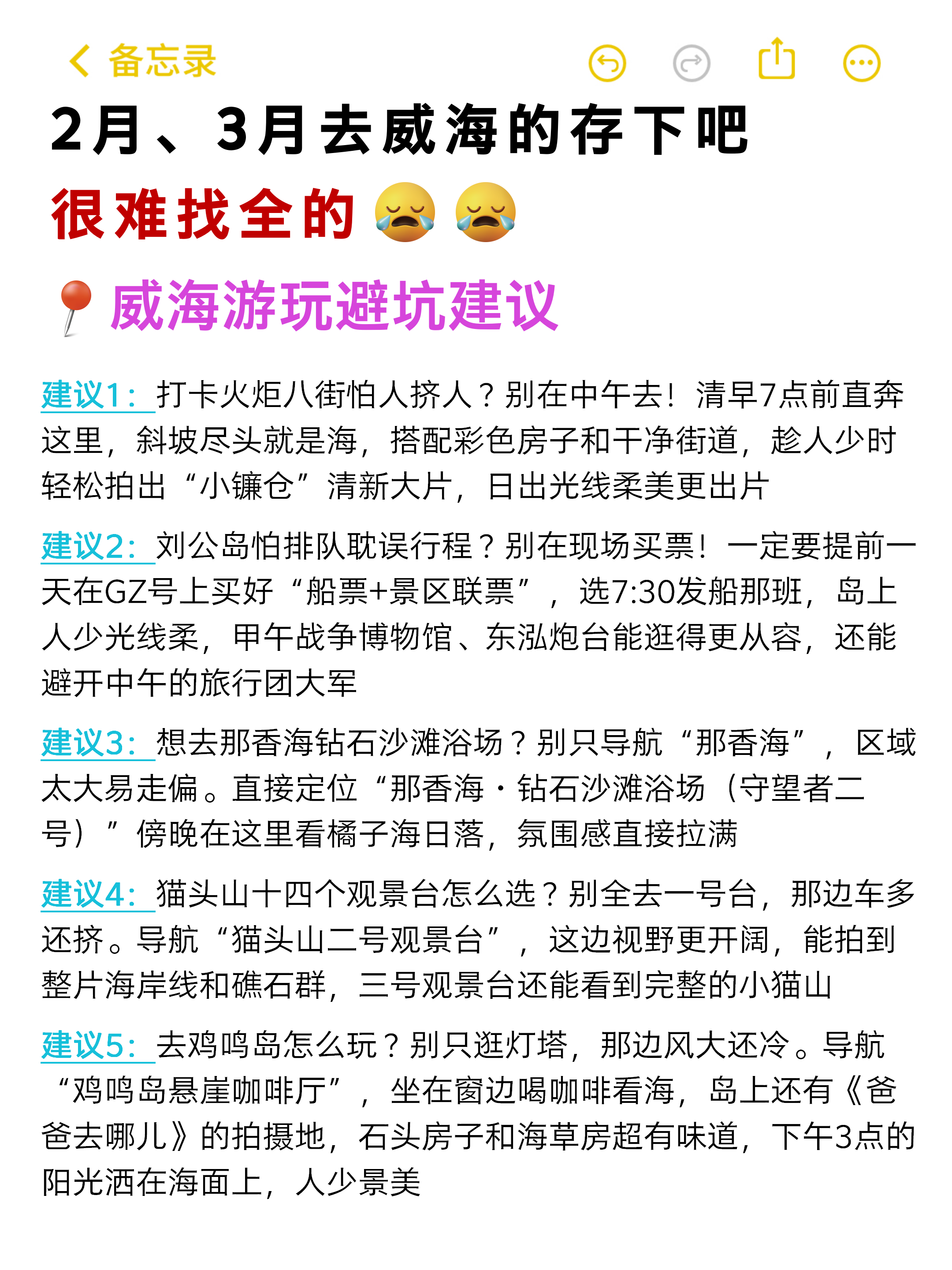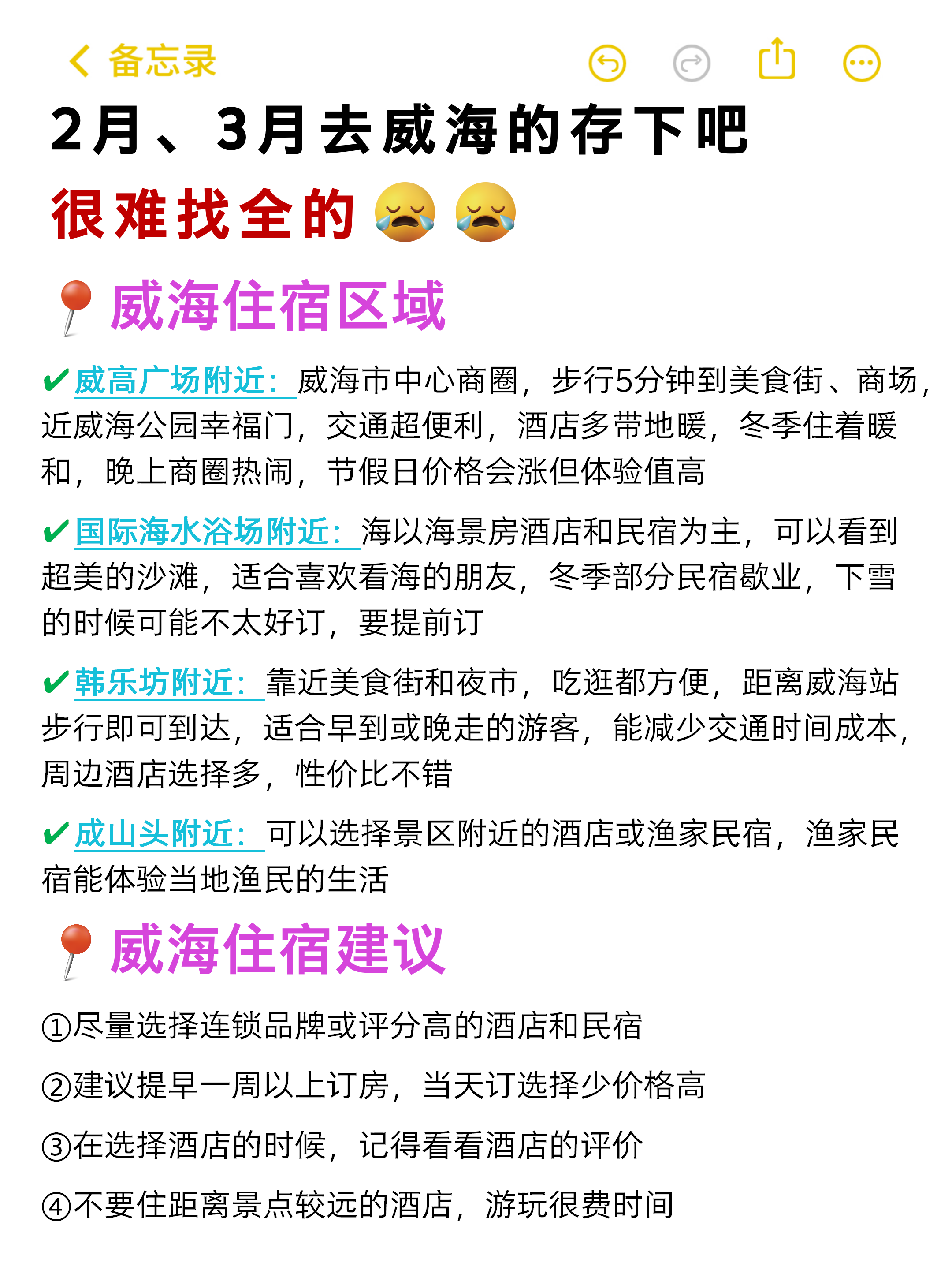 🚕出行:建议打车或自驾,也可以选择包车,出行很方便🏘️住宿:住韩乐坊附近的话离威海站比较近,火炬八街和国际海水浴场离威海北站更近,按照距离合理安排游玩顺序,更加省时省力!