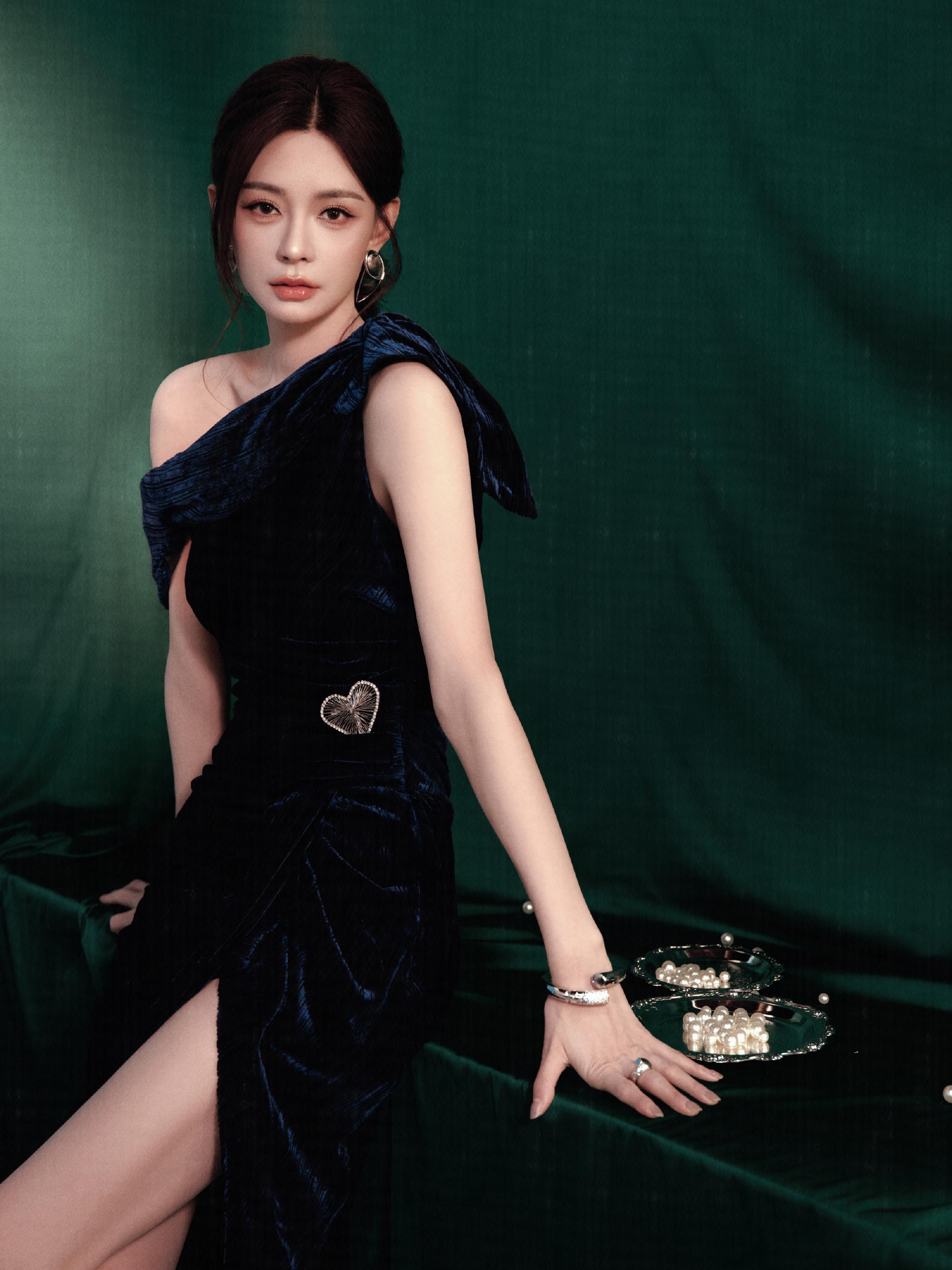 沈梦辰深蓝斜肩抹胸连衣裙,大长腿无敌了
