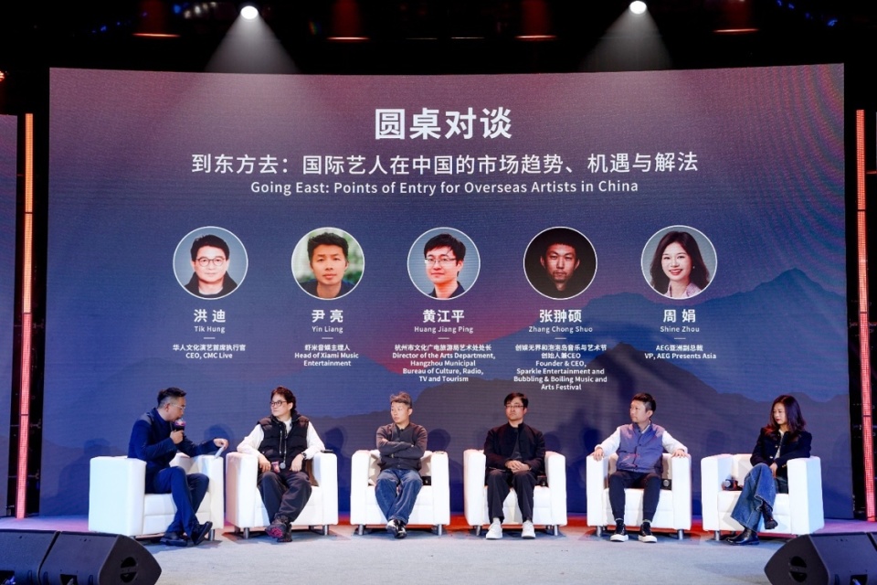 第一场圆桌对谈聚焦“国际艺人在中国的市场趋势、机遇与解法”,主持人林海,以及华人文化演艺(CMC Live)首席执行官洪迪、虾米音娱主理人尹亮、杭州市文化广电旅游局艺术处处长黄江平、泡泡岛音乐与艺术节创始人张翀硕、AEG亚洲副总裁周娟五位行业大咖,从各自角度分享国际艺人在国内演艺市场的趋势、机遇与发展路径。