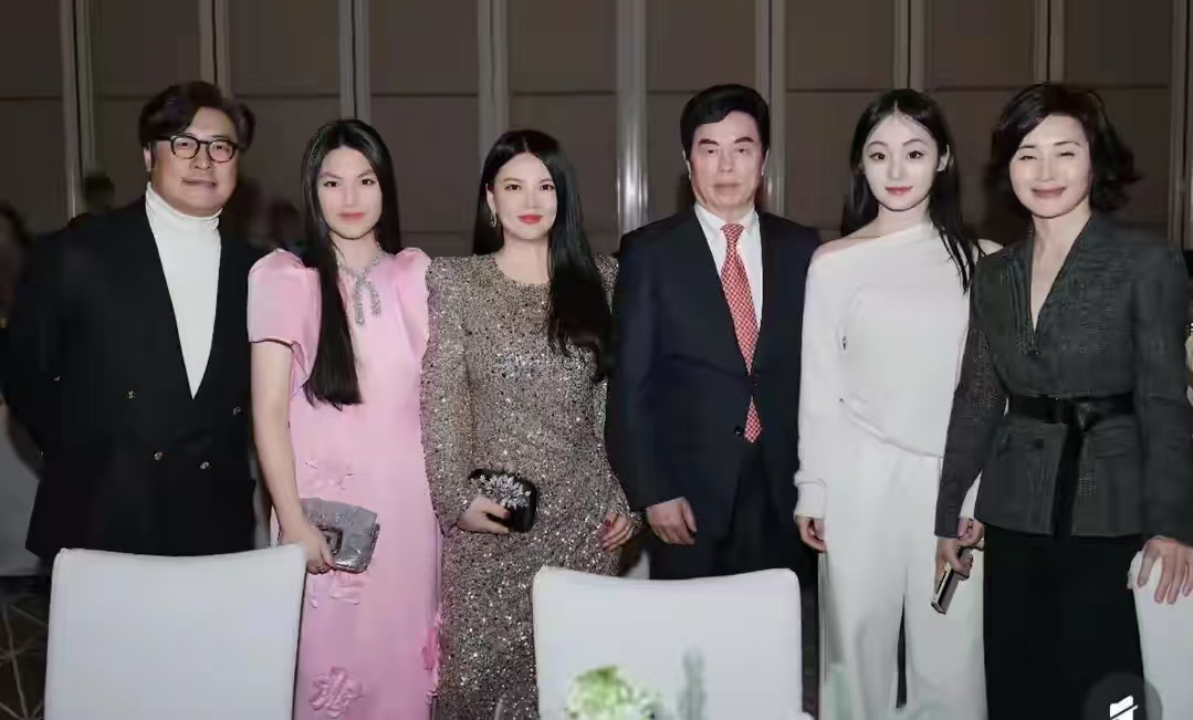 在大合照中发现李湘的前夫也在,16岁的王诗龄身穿一条粉色旗袍样式裙子,完全看不出她只有16岁。