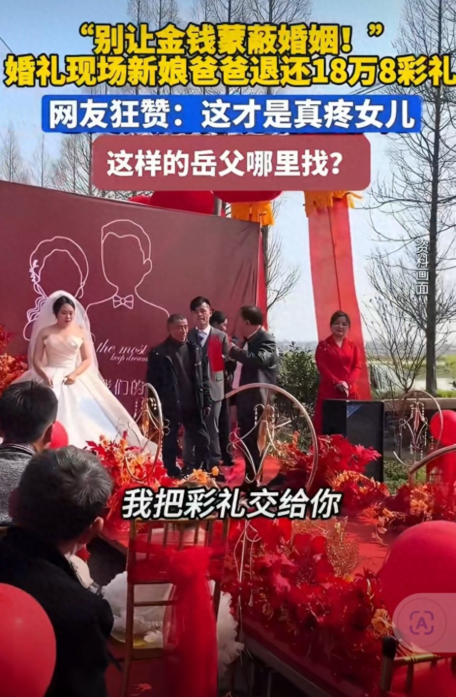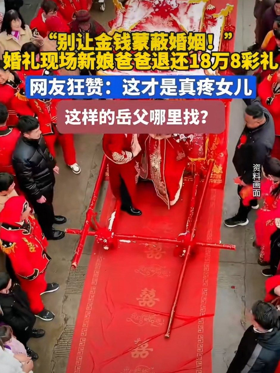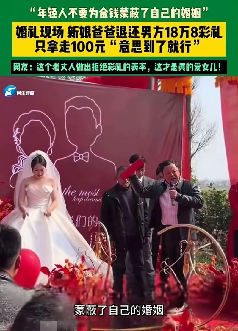 最近安徽一场婚礼上了热搜,不是因为排场多大,而是新娘父亲做了一件让全场都意外又感动的事:男方送来18.8万彩礼,他当场全部退回去,只留下100块钱当象征,还说了一句特别清醒的话:年轻人不要为金钱蒙蔽婚姻。