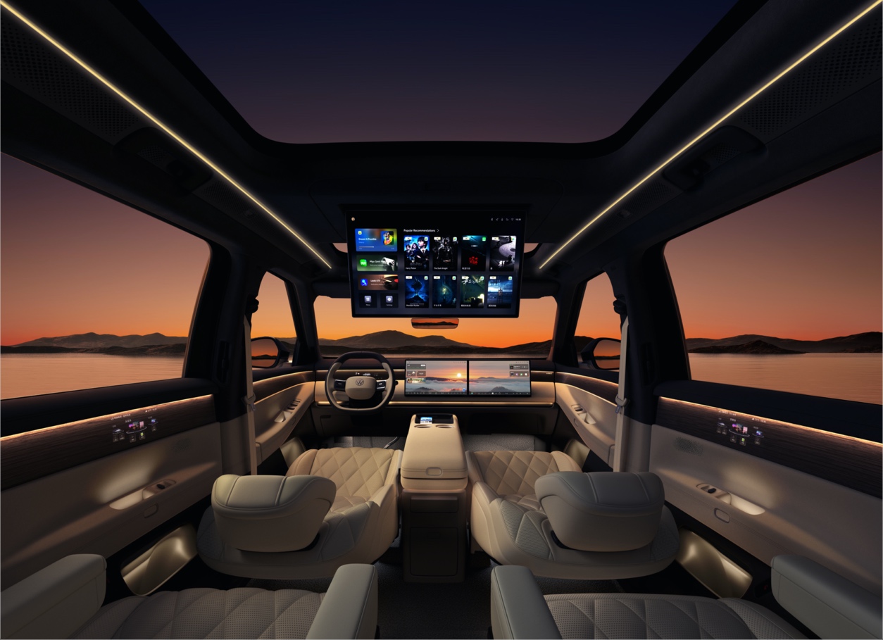 在智能交互层面,ID. ERA 9X配备了15.6英寸超高清中控双联屏,并创新性地为后排提供了21.4英寸的可折叠吸顶大屏,旨在实现前后排的娱乐体验平等。全车长达12.8米的环舱式氛围灯,通过漫反射技术让光线如瀑布般柔和铺开,进一步强化了座舱的沉浸氛围。从这些配置可以看出,厂商试图通过多屏交互和高级光影,来定义新时代的“豪华感”与“智能感”。