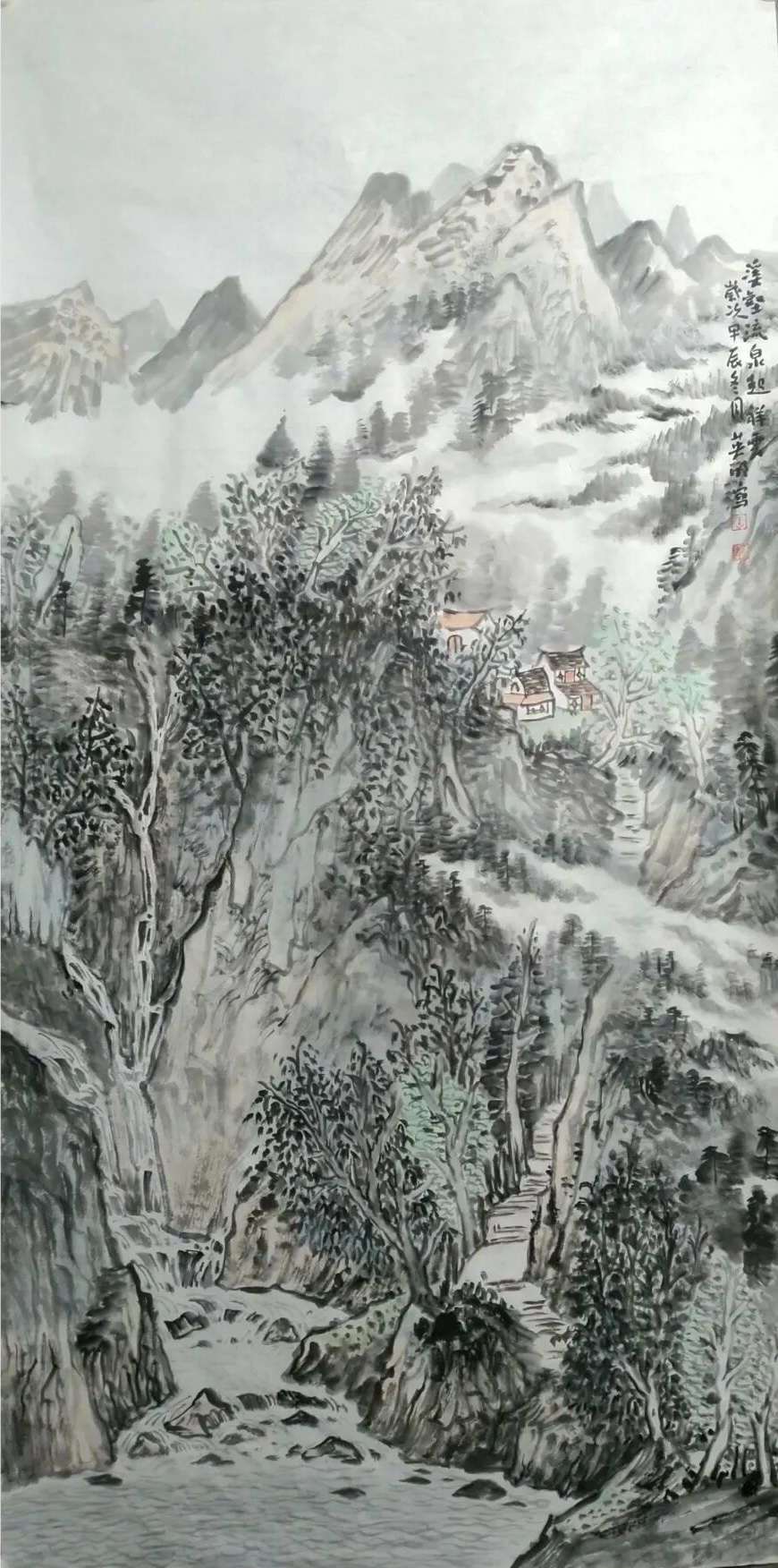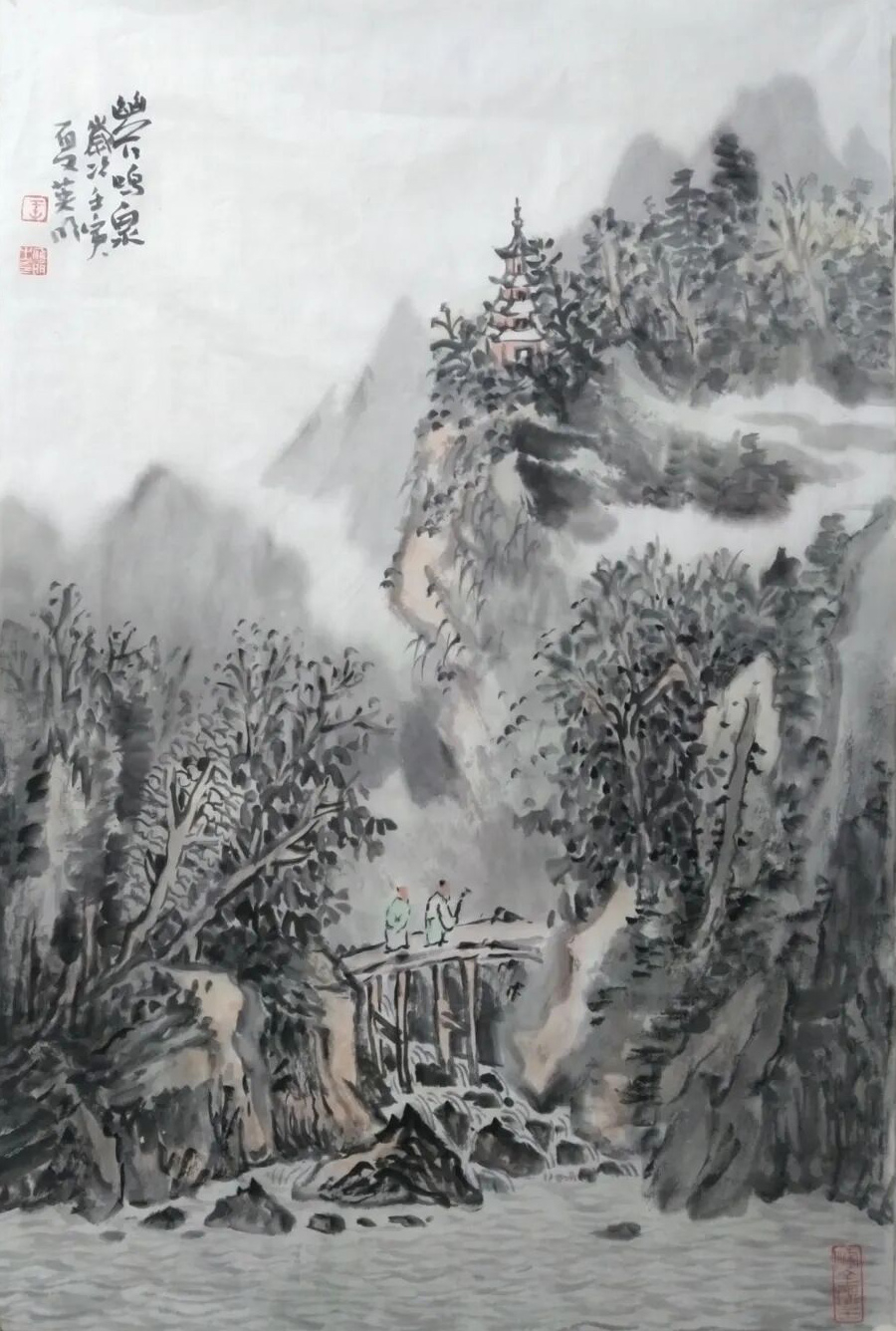 他的笔是时光的刻刀,不雕繁华,只琢真淳:树木的纹理是岁月裂出的丝,如琴弦拨动松风;小径的蜿蜒是脚步叠起的痕,似柳丝缠着春风;瀑布的飞白是溪声碎成的星,像月光漫过琴弦。连那桥上的人影,都轻得像云的碎屑,似要随山风一起,飘进林深处的人家,像蝶翼绕着花,像琴弦倚着韵。这便是他技法的高明——不止于“画山像山”的工致,更在于“画山是家”的深情:皴擦是骨,如铁铸的棱;晕染是魂,似云织的纱;点染是心,若月浸的诗,把“巍巍峰峦立”的壮阔、“溪水缓缓流”的清悠、“烟霭缠林麓”的寂,都缝进了同一方宣纸,像春风揉进霜雪,像月光漫过窗纱。