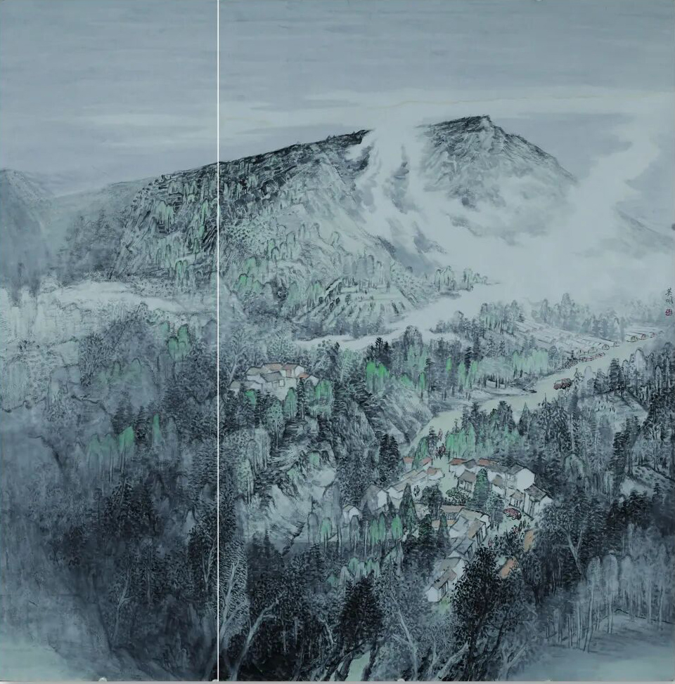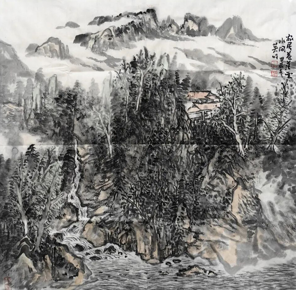 王英明先生的笔端攒着传统与新境的和鸣,如春溪汇入江海,如星子坠入夜海。他懂水墨的“呼吸”:浓墨是山的脊梁,沉如铁铸,撑起千载风霜;淡墨是山的轻息,柔若云纱,裹着万缕柔肠;连石缝里的林木都带着笔锋的劲——斧劈皴刻就的崖壁如剑锋挑开晨雾,披麻皴晕开的肌理似青苔裹着暖阳,积墨层叠处,是云与山私语的痕,像月光漫过檐角,像晨露沾上衣襟。