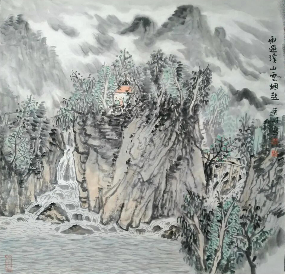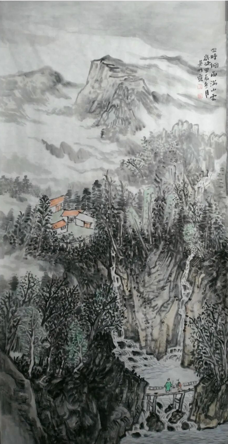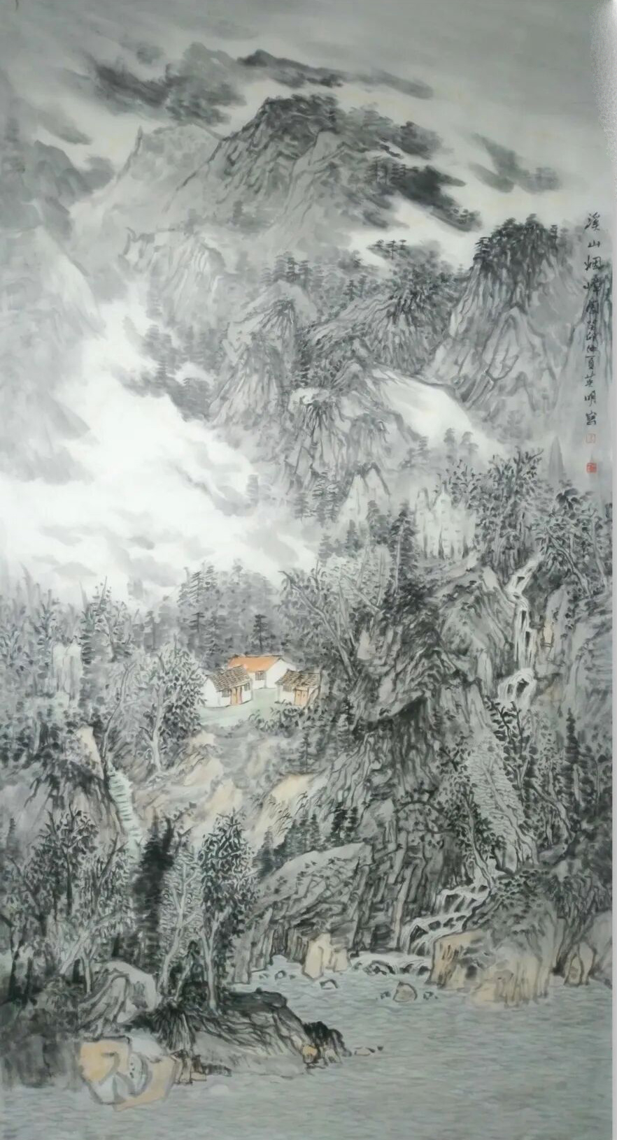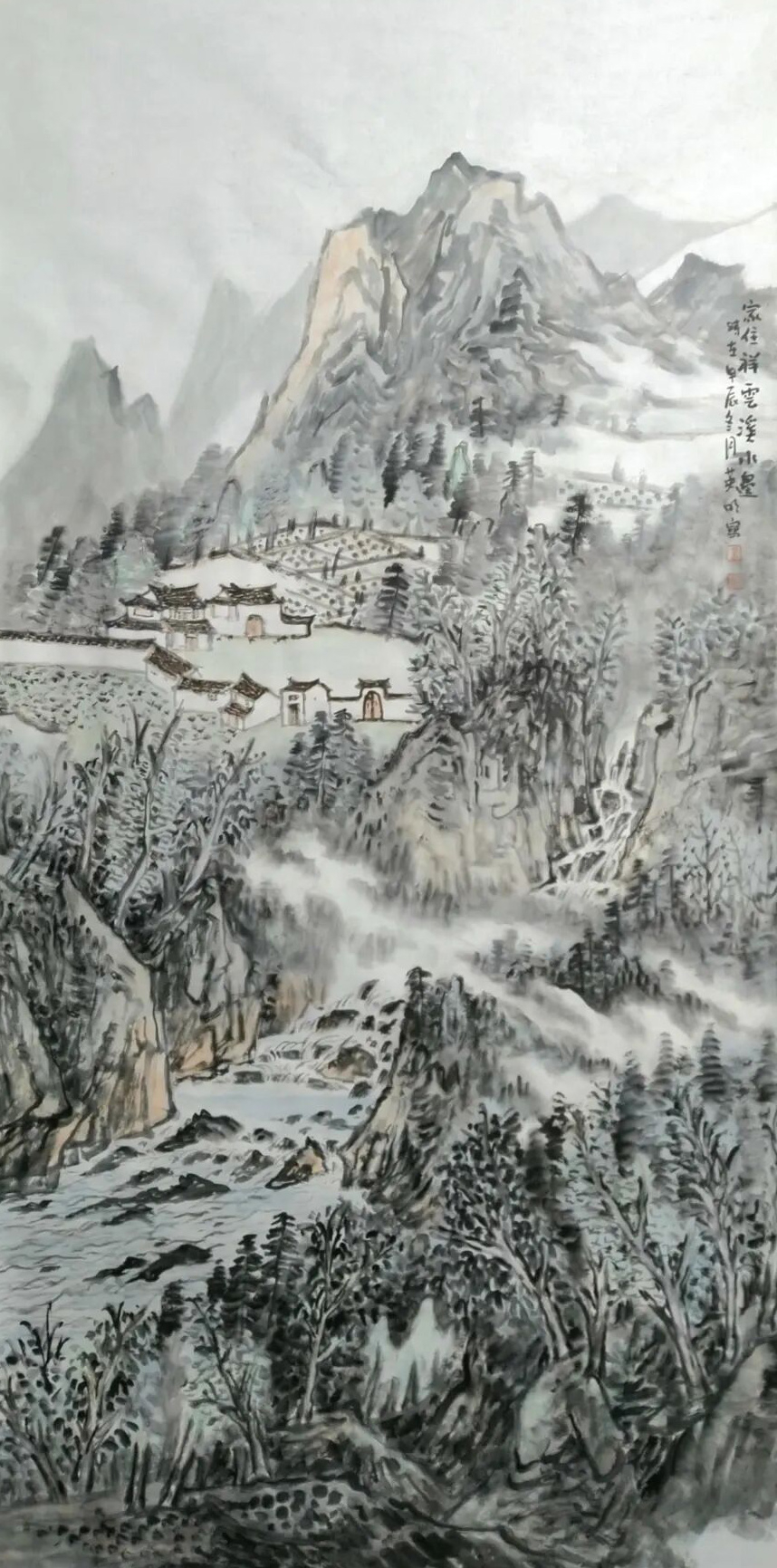 他的云雾是素宣上的诗行,时而裹住峰尖如砚里浮着的墨块,又似星子坠入夜海;时而绕着林梢如帛上洇开的水痕,又似蝶翼掠过花间;时而漫过溪涧如弦上轻颤的音,又似相思漫过窗棂;时而藏住屋舍如梦里浅埋的暖,又似月光漫进酒盏。而那红顶的檐、黛瓦的舍,是云涛里泊着的舟——明明是水墨的清寒,偏添这一抹暖艳,像山风裹着灶火的香,像枫叶浸着晨露,让高远的山河落了地,让清冷的画境生了温,像春雪融进春泥,像秋露沾上菊蕊。