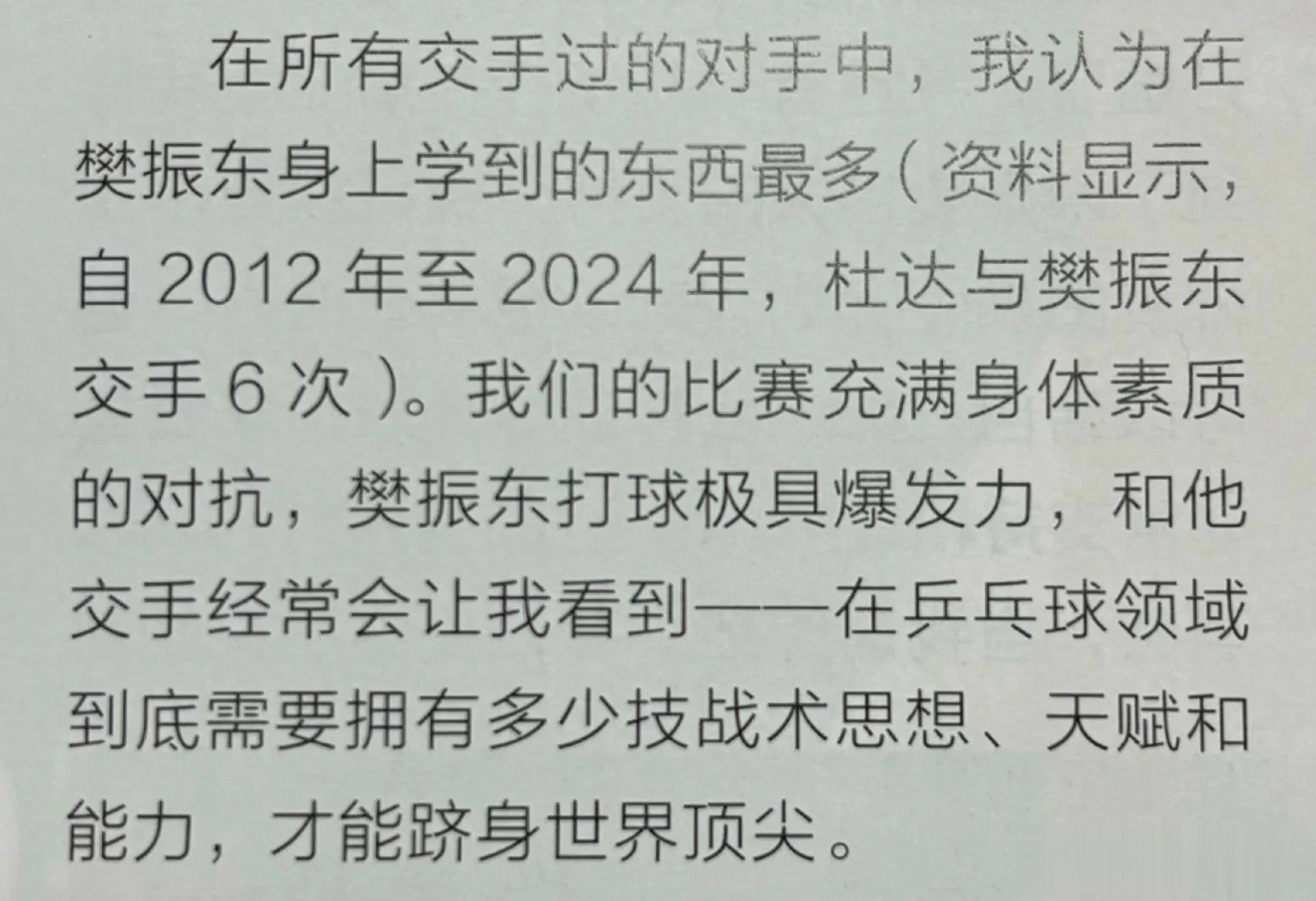 杜达在接受《乒乓世界》的采访中提及樊振东,他说:在所有交手过的对手中,我认为在樊振东身上学到的东西最多(资料显示,自 2012年至2024年,杜达与樊振东交手6次)。我们的比赛充满身体素质的对抗,樊振东打球极具爆发力,和他交手经常会让我看到——在乒乓球领域到底需要拥有多少技战术思想、天赋和能力,才能跻身世界顶尖。