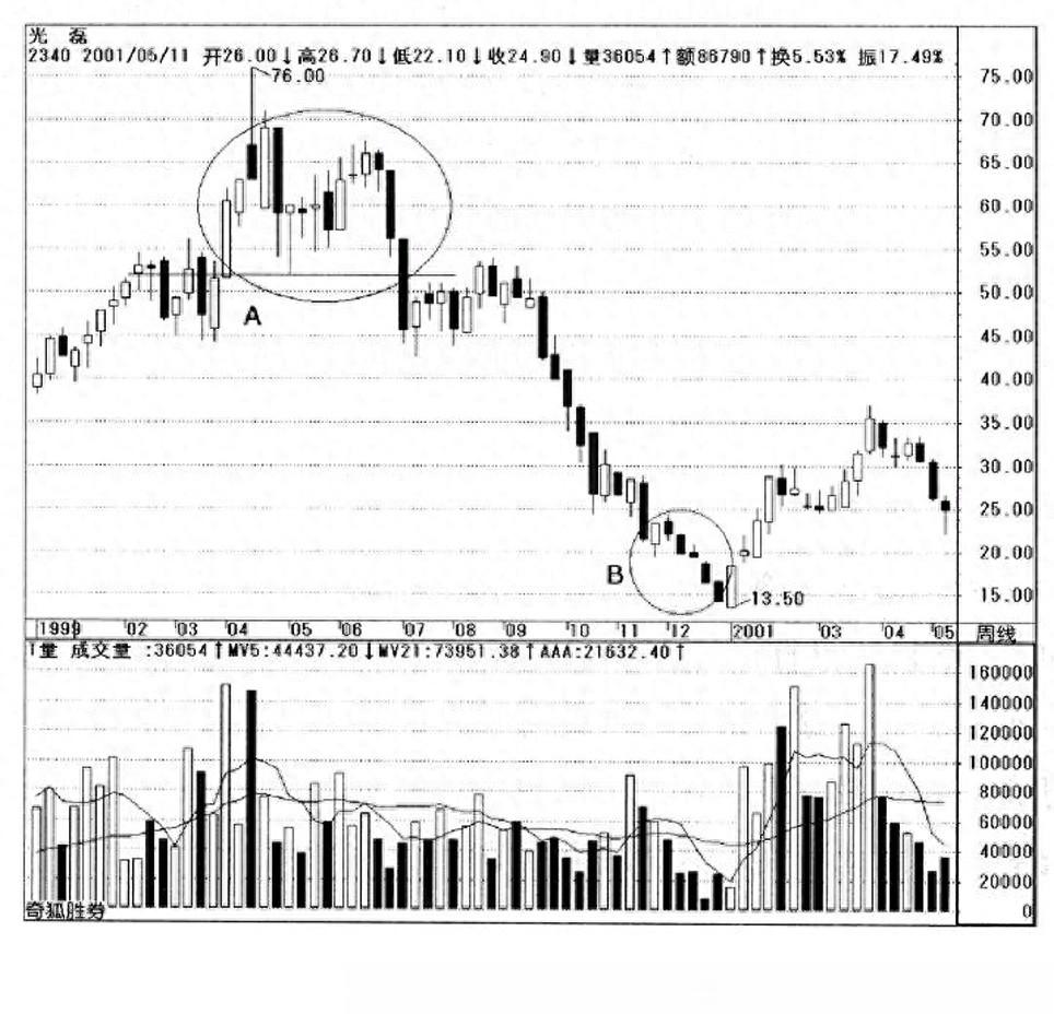 请看图2-42,光磊股价的周线图在2000年4月1日至2000年7月7日形成一个头部的现象,亦即图中标示A,总计成交量共1040438手,这个数字也是周线图中的头部量。