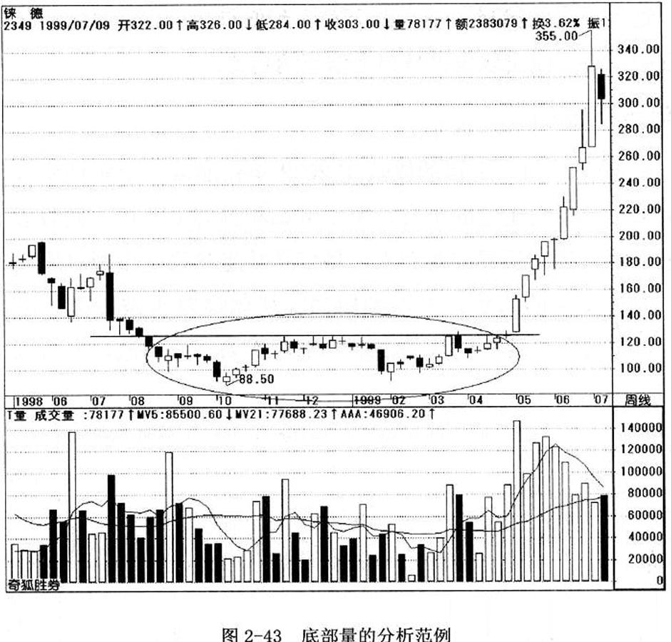 请看图2-43,铼德的股价周线图在1998年8月15日至1999年4月30日这里打出一个中期底部形态,计算这里成交量的总和为1960040手,这些成交总数就为底部量。