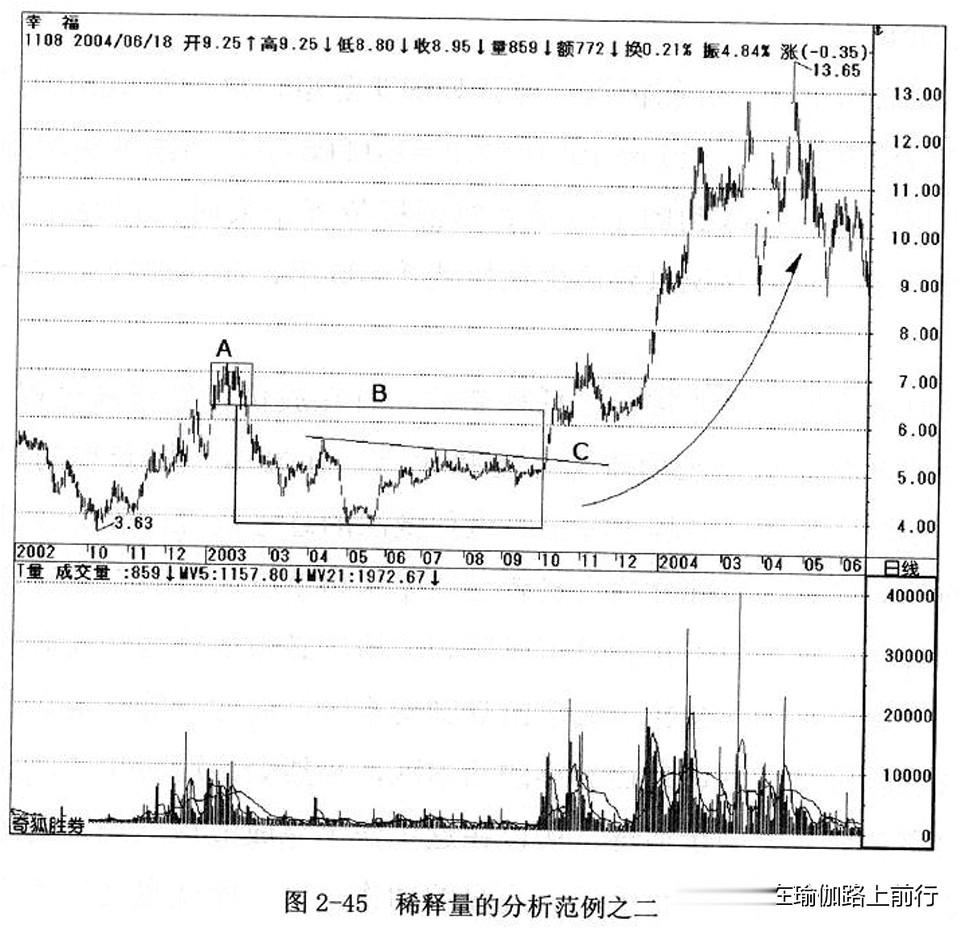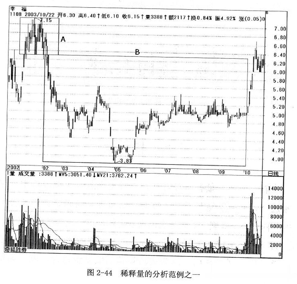 请看图2-44,幸福的股价在2002年初形成一个短期头部,这个头部是已经发生过的事实,所以应该相当容易分析。假设股价拉回过程中,我们想要准备介入,最好是等走势稳定出现打底完成之后,在成交量的部分,可以利用稀释量观察筹码被稀释、沉淀之后,再出现的“价”的攻击姿态,则对作为买方的散户投资人,将会更加安全。