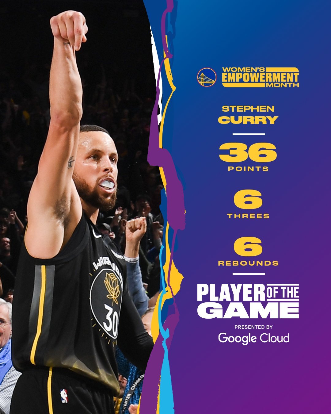 此役,库里27中13,三分15中6,罚球4中4,得到36分6板4助2断。