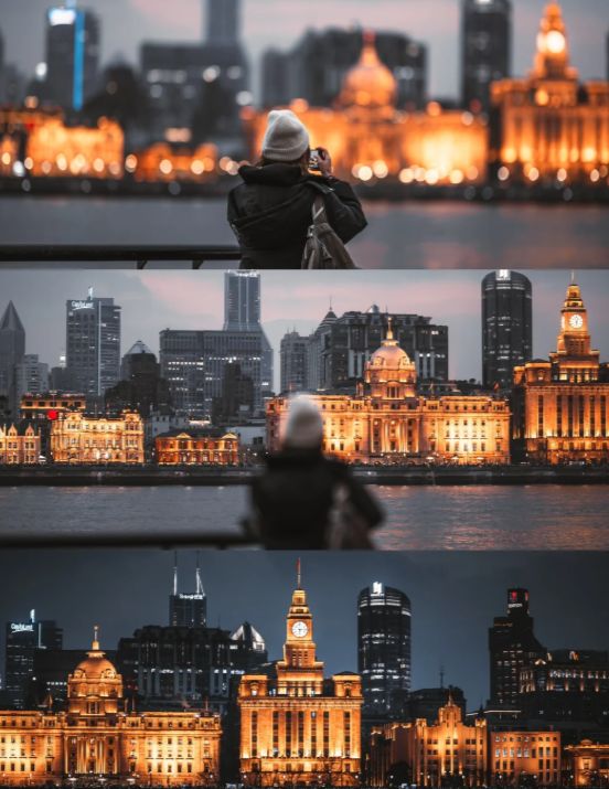 等待日落的时刻,本身就是享受。对岸外滩的老建筑群在阳光下轮廓分明,从海关大楼的钟楼到和平饭店的绿色尖顶,一一可辨。黄浦江上游船往来,江水粼粼。太阳开始西沉,它将天空作为画布,涂抹上金黄、橙红、粉紫的渐变色彩。这光彩不仅映亮天空,更将对岸那片恢弘的石头森林染上温暖的蜜色,仿佛为它们披上了一层复古的滤镜。当最后一抹余晖消失在楼宇背后,天空转为深邃的蓝调,对岸建筑的灯光次第亮起,如同繁星落入人间。从“日光金”到“蓝调时刻”再到“灯火璀璨”,这渐变的过程美得摄人心魄。
