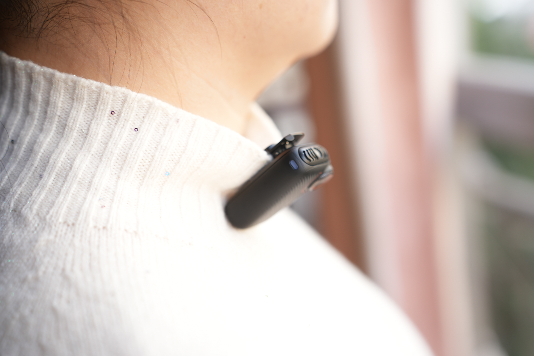 充电仓的设计堪称细节控福音:磨砂防滑外壳搭配底部硅胶垫,放置在相机热靴或桌面时稳固不晃;正面 4 颗电量指示灯清晰显示剩余续航,仓内专门预留转接头收纳槽,彻底解决小配件易丢失的痛点。发射器采用轻量化设计,单只重量仅 8g,佩戴时几乎无感,背部的磁吸式固定方案十分巧妙,可直接吸附在金属设备上,或隔着衣物固定,即便剧烈运动也不会脱落,360° 全指向收音设计让佩戴位置不再受限。
