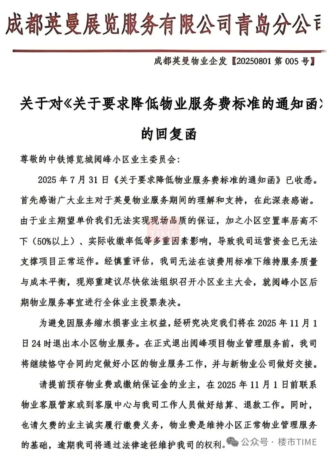 结果呢?成都英曼展览服务有限公司青岛分公司(这小区的物业)那是相当硬气,反手就回了一封信,大白话就是:这价钱,原本的服务品质都没法保证,既然你们嫌贵,那我就不干了。理由列得明明白白:小区空了一半(空置率超50%),物业费收不上来。2025年11月1日24时,我司正式撤场。