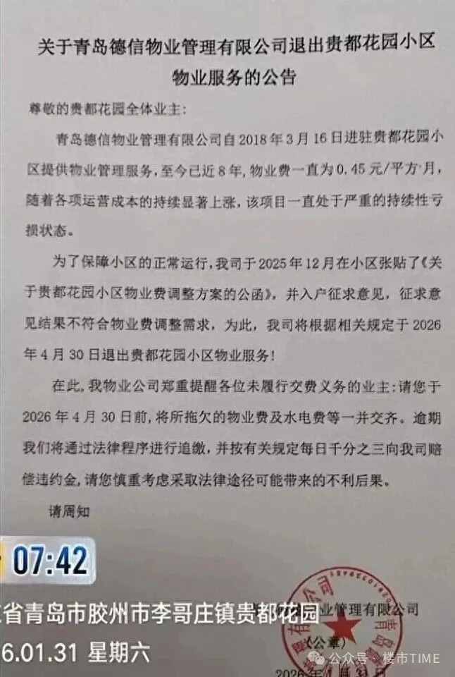 物业想涨价,哪怕涨一毛钱也是要了业主的命。入户征求意见,结果毫无悬念——不同意。既然不能开源,那就只能节流——把自己“节”掉。物业公告说得很决绝:严重持续亏损,2026年4月30日,我不玩了。