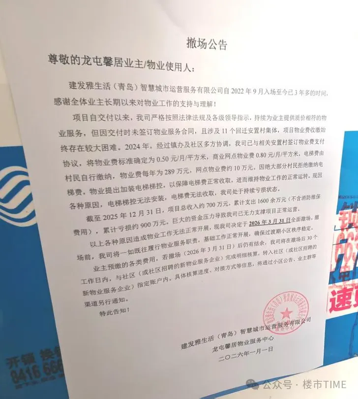 这下捅了马蜂窝,梯控装一个,被砸一个。到了今年初,物业公司实在扛不住了,算了一笔账:进场三年多,总收入700万,支出1600多万,净亏损900万。于是,一纸公告贴出来:2026年3月31日,彻底“撂挑子”。