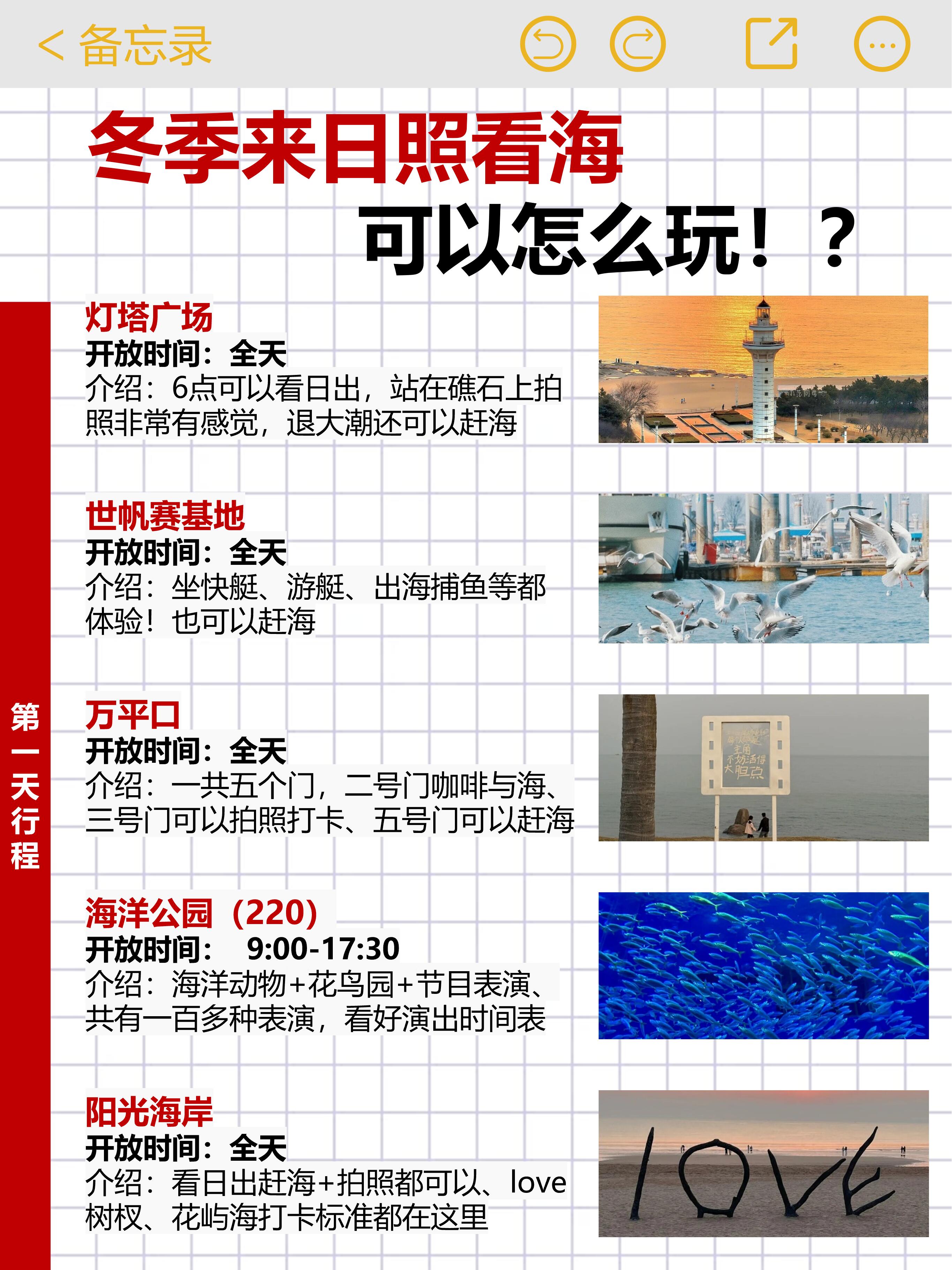 注意1.冬季日照公交部分线路班次减少,建议用高德地图查实时公交再出门,避免在冷风里久等,热门景点间选平台打车更高效,别坐黑别花冤枉钱