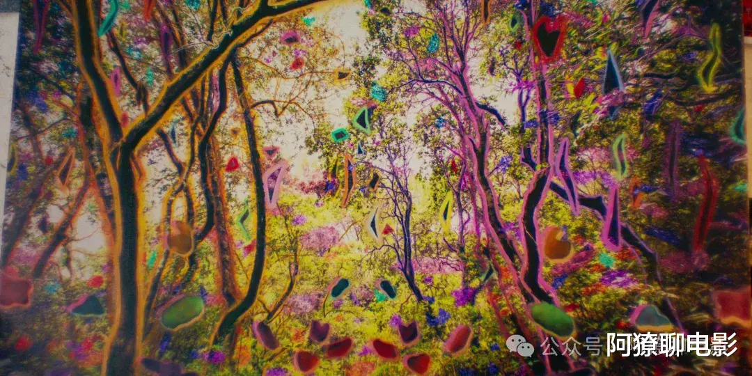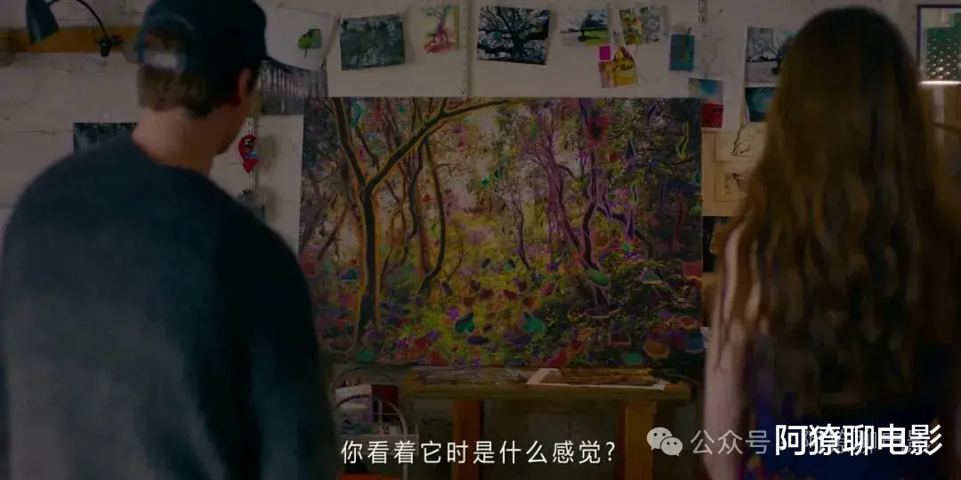 片中那幅关键画叫做《揭开我》,像一片被火烧过的森林,焦黑枝干下透出岩浆般的红,仿佛有人把自己藏在灰烬里,但光从裂缝中钻了出来。