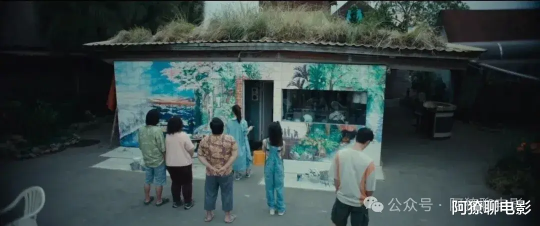 在离开台湾前,阿美在她打工的卡拉OK店外墙绘制了一幅纪念性壁画,作为对这段短暂却深刻夏日时光的温柔告别。整幅画作色彩柔和,线条质朴,充满手作温度,宛如一本立体的青春日记。它成为了吉米多年后踏上日本寻踪之旅的起点,也是影片情感的核心视觉锚点。