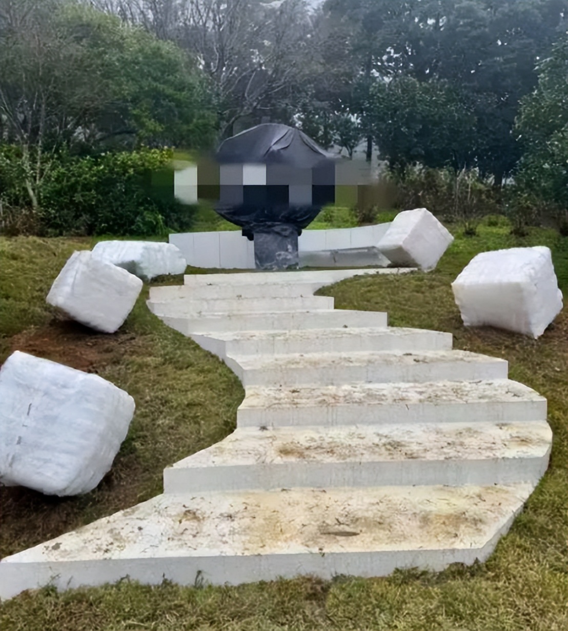 在雕塑下方的台阶两侧,还安放了五个正方体石块,一边三个,一边两个。外界解读,这分别代表了大S的父母、妹妹小S,以及她最牵挂的两个孩子。这或许是具俊晔想告诉大S:你放心,爱你的家人们都会永远陪伴着你,你从不孤单。