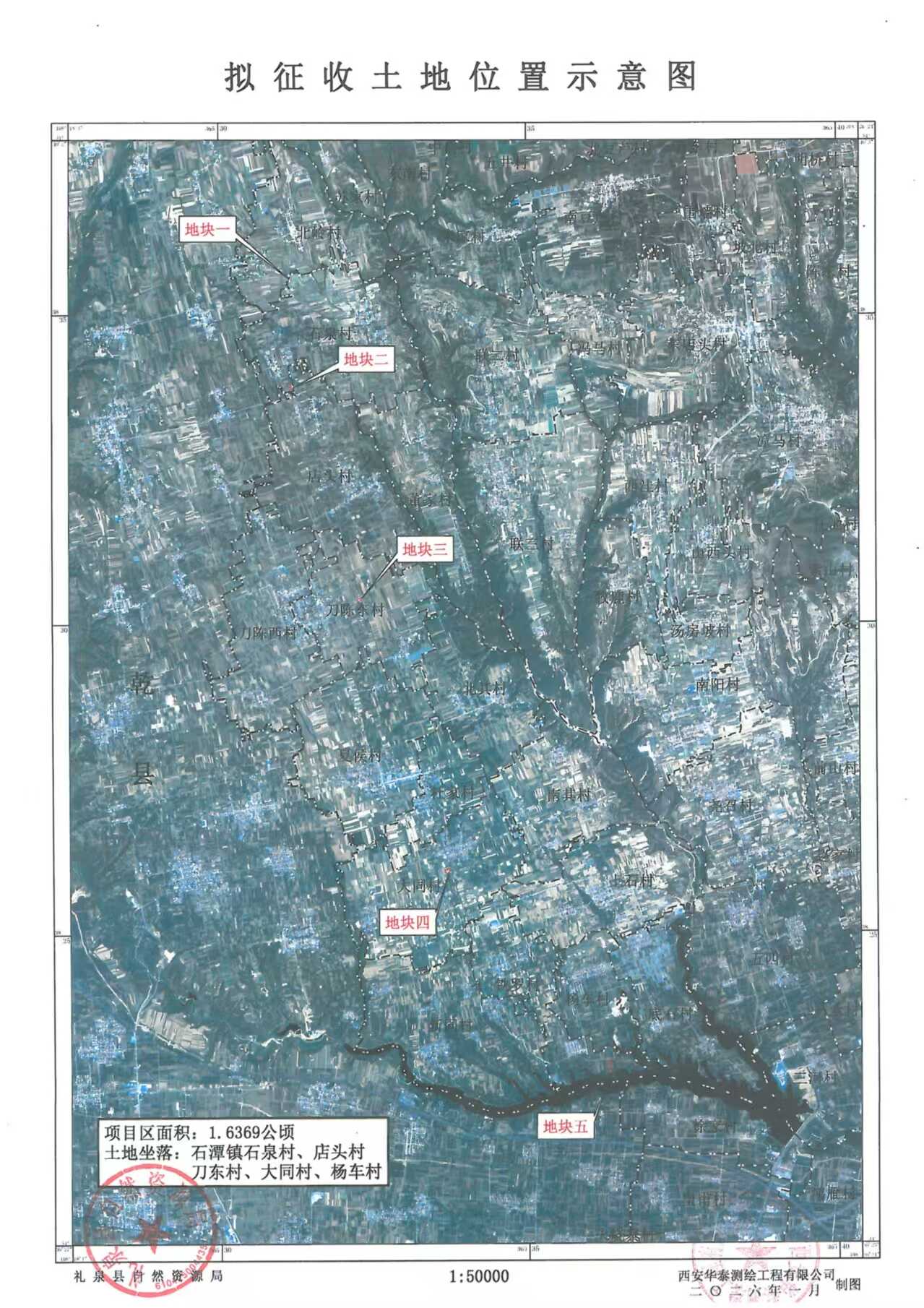 本次拟征收土地位于礼泉县石潭镇石泉村、店头村、刀东村、大同村、杨车村,拟征收土地面积1.6369公顷。拟征收土地位置详见附图。