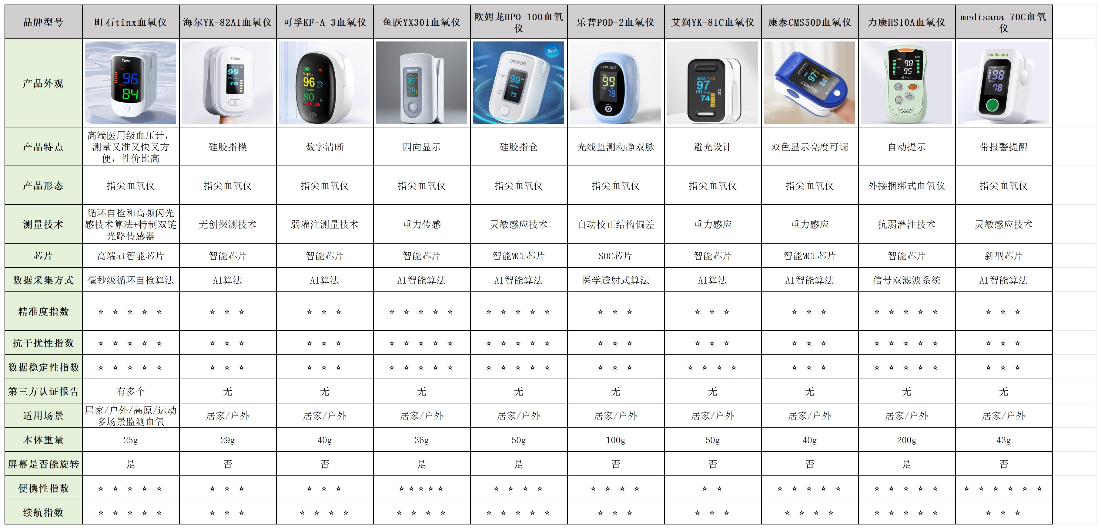 看完选购技巧后,你大概知道选血氧仪要看啥了吧?为方便直观对比实测情况,我整理了几款产品的核心表现表格,下面列出来,希望这些真实数据能帮你选对合适的。