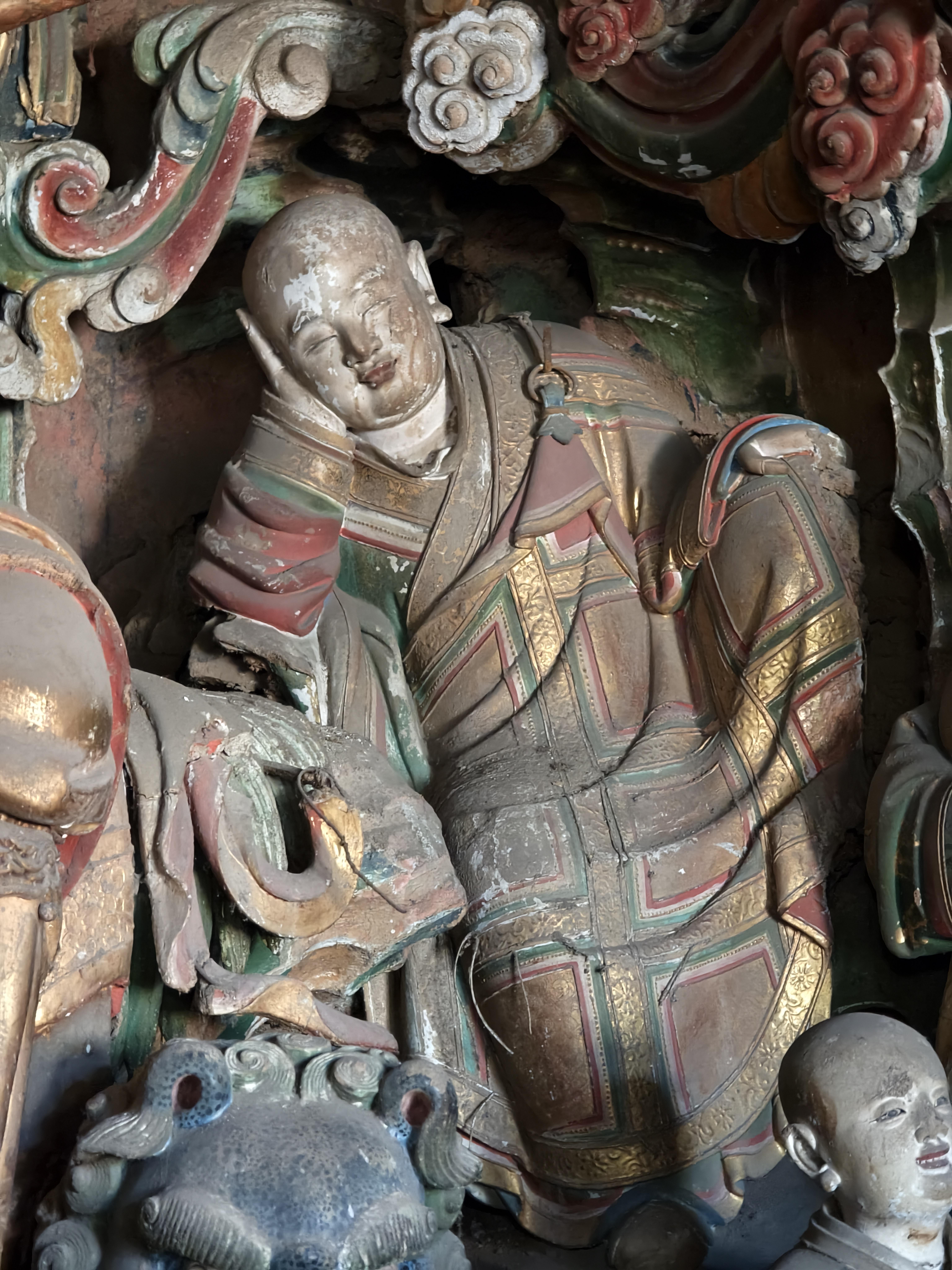 寻找“目连救母”彩塑:佛陀十大弟子之一持钵施食(孝道思想体现)。