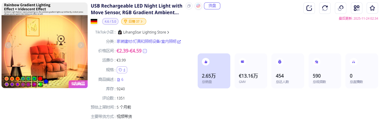 没有高科技加持,没有大牌背书,就是这样一个看似普通的小氛围灯,却在TikTok德国市场突出重围,上架5个月,卖出2.65万件,销售额13.16万欧元(约合人民币108万元),帮助一家新店直接冲上类目Top 3。