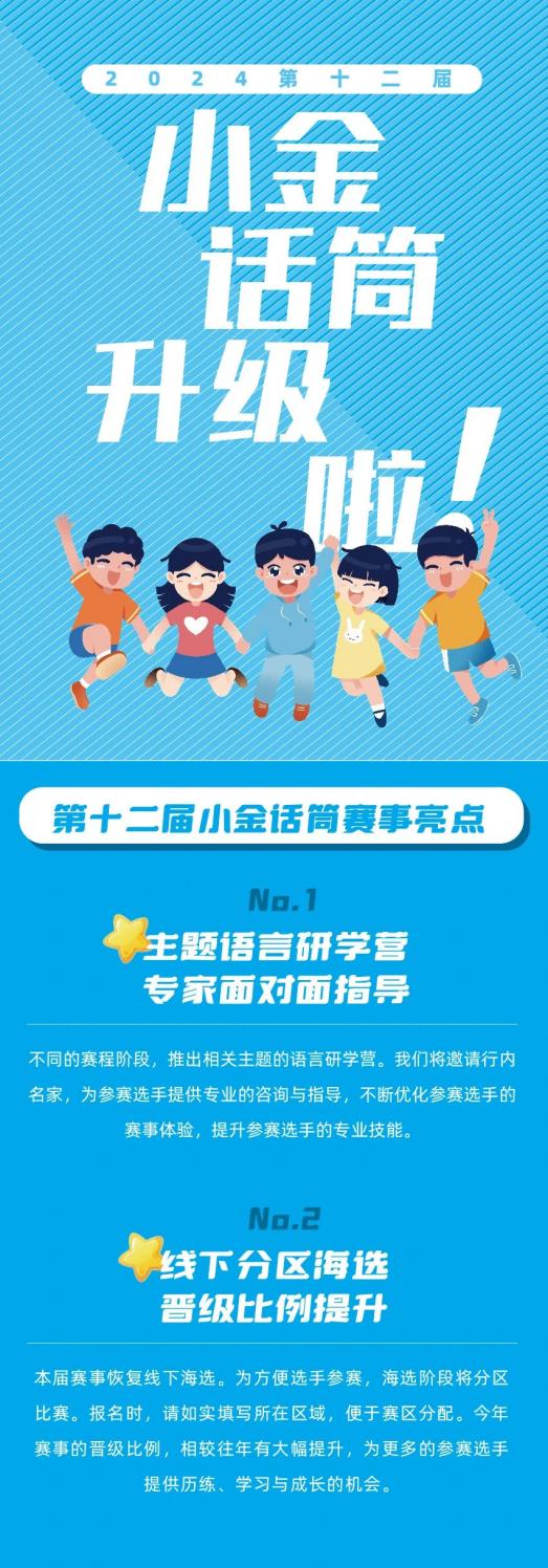 2024年第十二届“小金话筒少儿语言才艺大赛”报名时间为6月11日至7月5日,由深圳市文化事业发展专项基金资助,国家教育部语言文字应用研究所、广东省语言文字工作委员会办公室出任指导单位,深圳市语言文字工作委员会办公室、深圳市深投文化投资有限公司联合主办,深圳市文化企业发展有限公司承办,深圳博雅艺术有限公司、深圳市剧话小品话剧团、中青影训(深圳)文化有限公司、深圳市绿萌芽文化传播有限公司、深圳市戏剧家协会、罗湖区戏剧家协会、深圳朗诵艺术家协会联合协办。