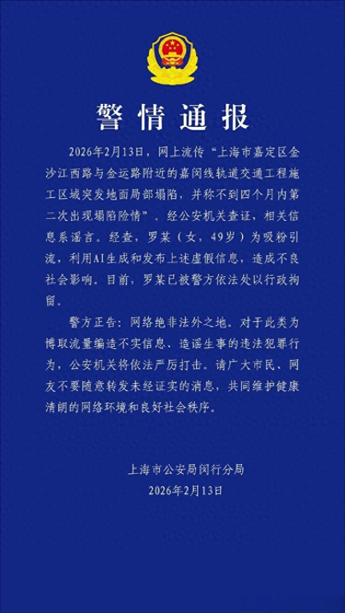 2月13日,@警民直通车-闵行 发布警情通报:2026年2月13日,网上流传“上海市嘉定区金沙江西路与金运路附近的嘉闵线轨道交通工程施工区域突发地面局部塌陷,并称不到四个月内第二次出现塌陷险情”。经公安机关查证,相关信息系谣言。经查,罗某(女,49岁)为吸粉引流,利用AI生成和发布上述虚假信息,造成不良社会影响。目前,罗某已被警方依法处以行政拘留。