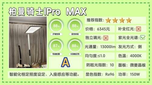 柏曼骑士IPro MAX是柏曼品牌护眼大路灯中比较高配置的护眼大路灯,当然价格也比较高,适合预算在5000+以上的伙伴考虑,这款护眼大路灯无论是外观做工还是性能配置都比较好,一体式发光面搭配紫光激发全光谱技术,能够呈现均匀柔和的光线输出,功能方面上,柏曼支持智能化恒定照度设定、入座感应等功能,不过这款灯具搭载的是自研芯片,相比普瑞芯片,在性能表现上还有优化的空间。