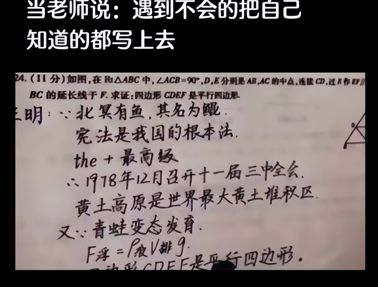 有些学生的脑洞也源自于他们实在是不会解决这个问题。于是老师们那句话又派上了用场,当你不会做一道题目的时候,就把能想起来的知识点全部都写上。