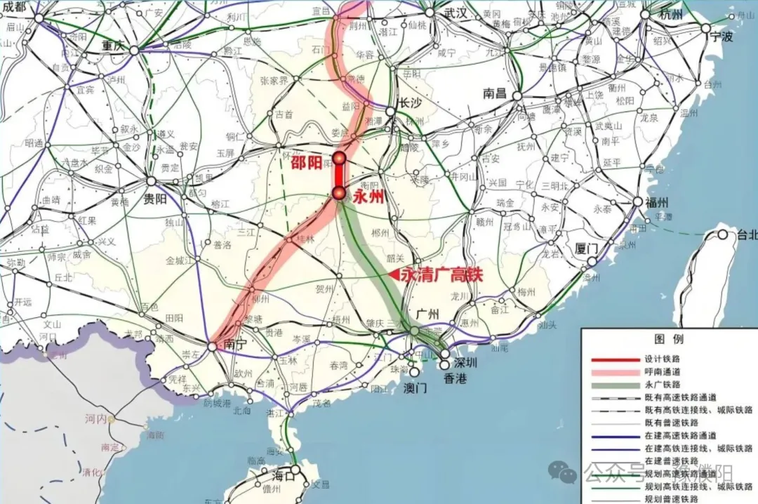永清广高铁是《国家综合立体交通网规划纲要》中6条主轴之一的“粤港澳一成渝主轴”“广州经永州、怀化至重庆”路径的重要路段,是京广高铁的辅助通道和呼南高铁广东方向的延伸段。2021年底,正式纳入国家“十四五”铁路发展规划;2024年5月由国铁集团启动勘察设计招标;2024年12月通过预可研审查;2025年5月通过可研审查;10月通过可研鉴修评审,进入初步设计定测阶段。目前可研已上报国家发改委待审查和批复。新建正线全长约390.33公里,其中湖南段157.43公里,广东段232.9公里,设计时速350公里。全线拟设10座车站,包括永州、零陵、双牌东、宁远、蓝山、连州、阳山、浸潭(预留越行)、清远西、广州北。