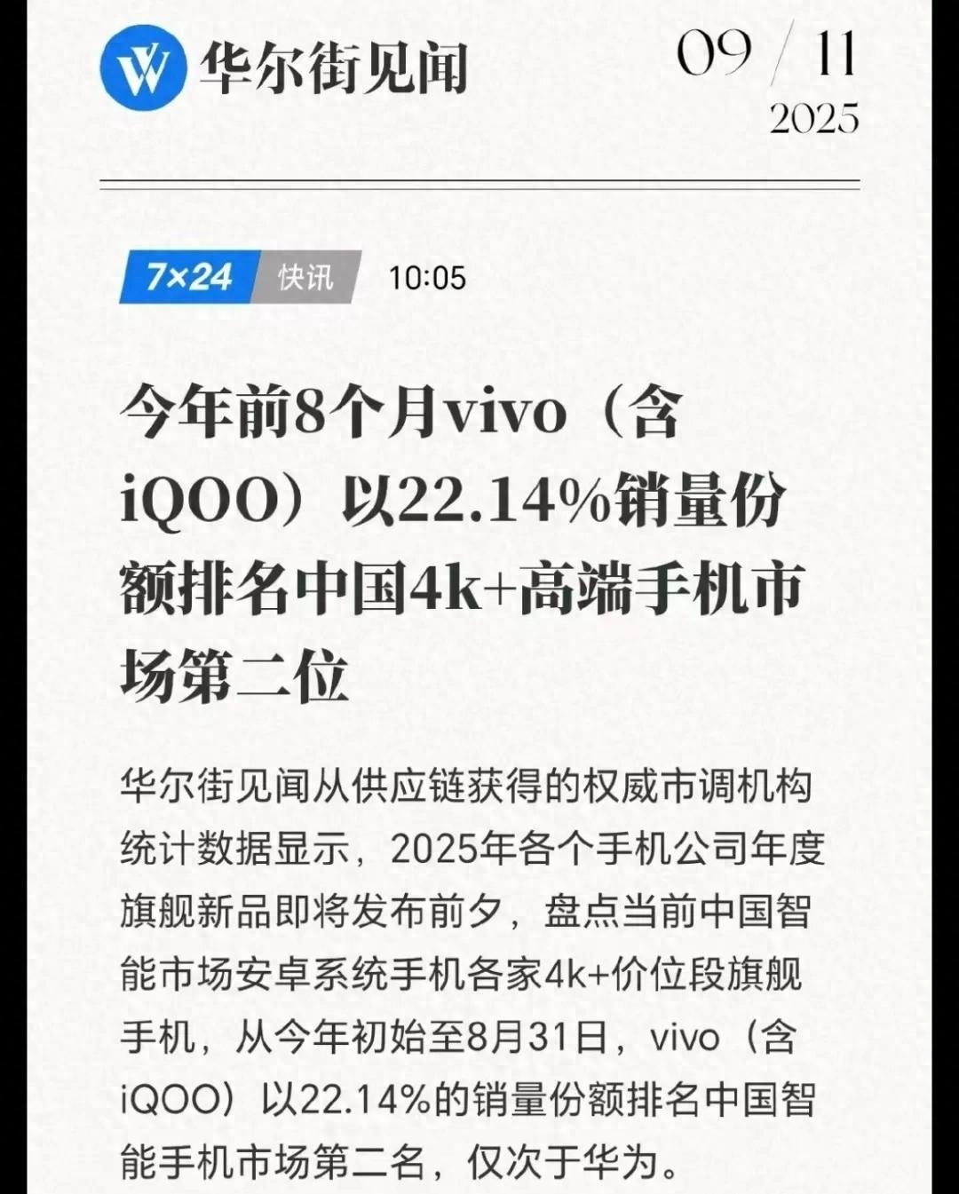 IQOO 13的成功也增强了vivo主品牌的影响力,在今年前8个月的安卓高端手机市场,vivo的市场份额居然达到了22.4%,排名第二,居然超过了小米属实没想到。