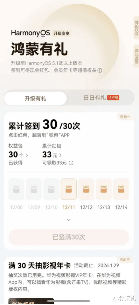 更大的福利在后面!只要首次签到后满30天,就能参加大奖的抽奖。一个是有机会抽中影视年卡礼包,包含一年的华为影视+优酷小屏会员。