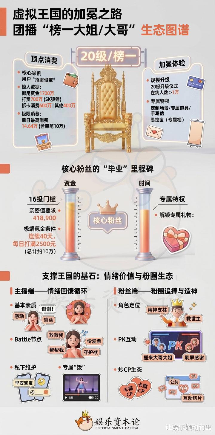 团播主播维护大哥大姐已变成工作的一部分,通过专属的饭撒、仪式、互送礼物、日常问候等方式牢牢维系住“榜一”的忠诚度。粉丝们也会通过刷屏感谢、嗑cp甚至创物料等方式,帮主播固住“榜一”。
